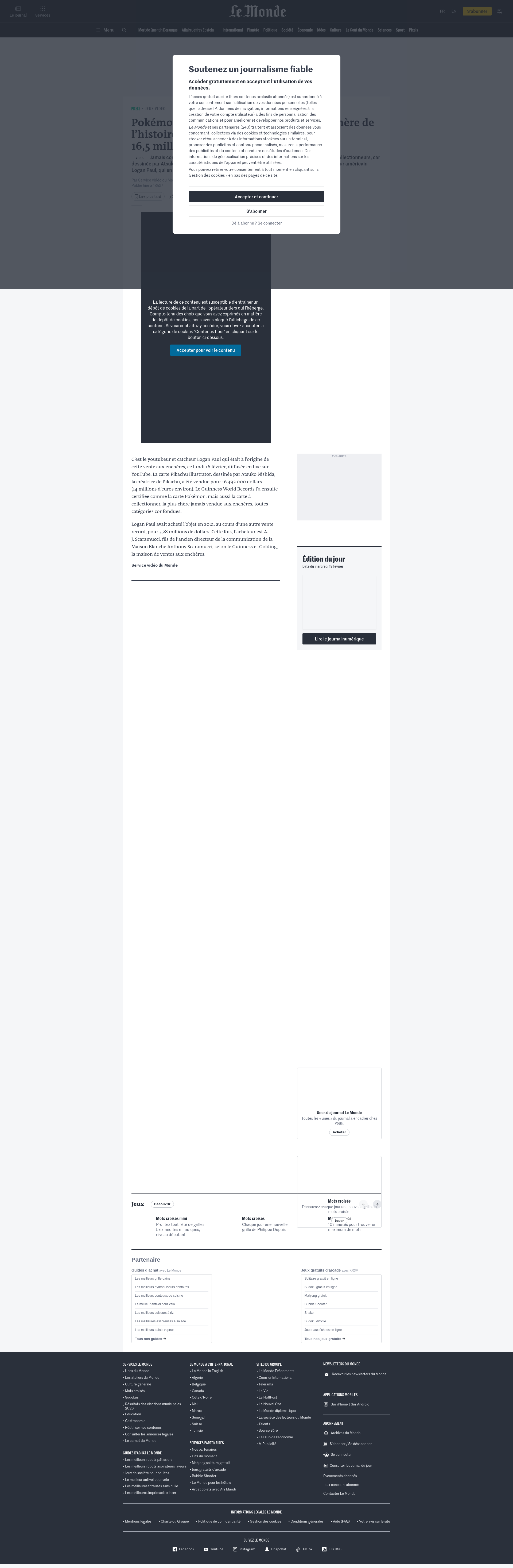 Vidéo. Pokémon : les images de la carte la plus chère de l’histoire, vendue aux enchères pour 16,5 millions de dollarsVidéo - Jamais commercialisée, cette carte rare, dite Pikachu Illustrator, est très prisée des collectionneurs, car dessinée par Atsuko Nishida, la créatrice de Pikachu. Elle avait été vendue en 2021 au youtubeur américain Logan Paul, qui en profite pour tripler son investissement.PNGPDF