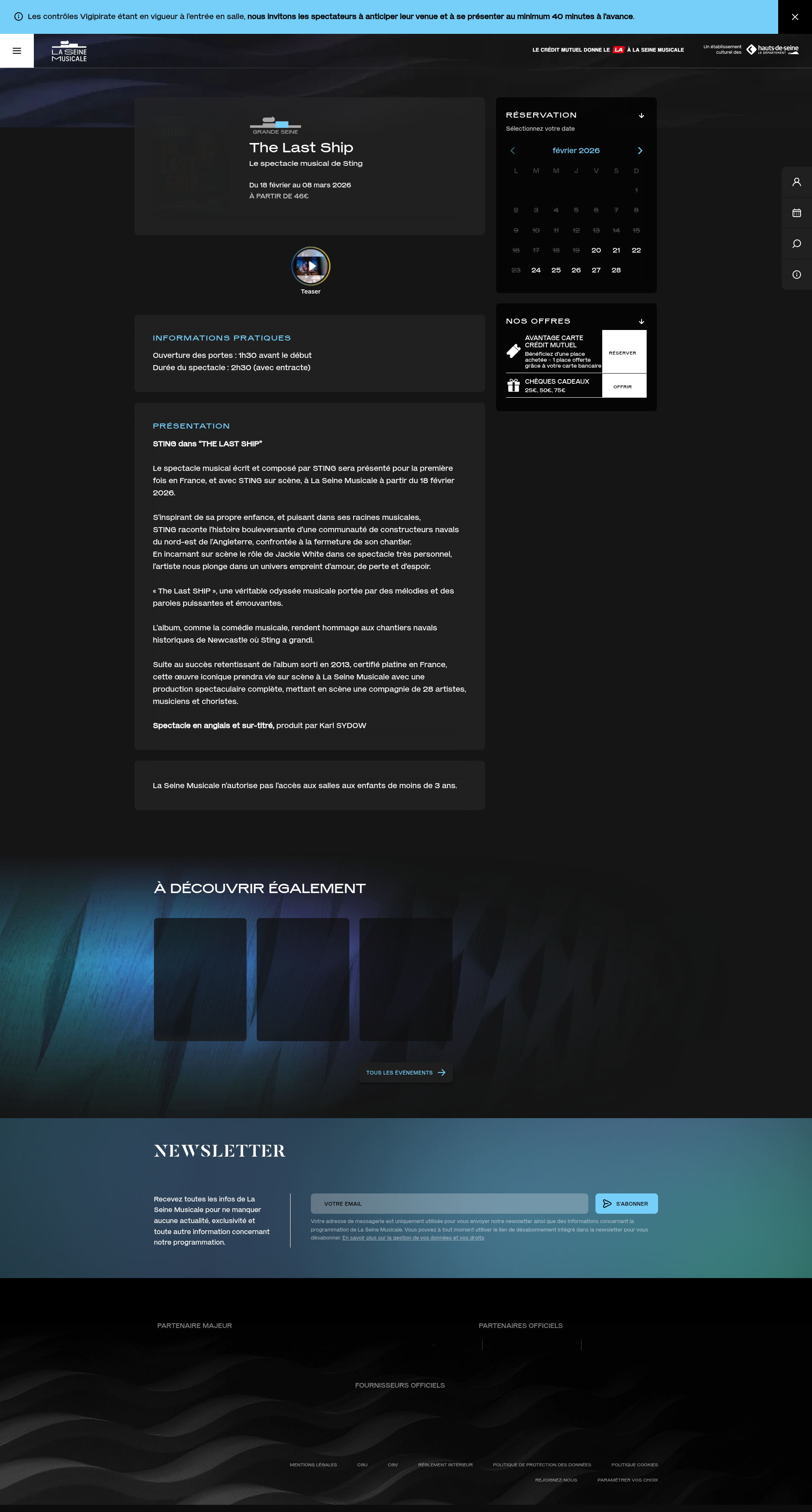 STING dans “THE LAST SHIP” à La Seine MusicaleBilletterie officielle. STING dans “THE LAST SHIP” Le spectacle musical écrit et composé par STING sera présenté pour la première fois en France, et avec STING sur scène, à La Seine Musicale à partir du 18 février 2026. S’inspirant de sa propre enfance, et puisant dans ses racines musicales, STING raconte l’histoire bouleversante d’une communauté de constructeurs navals du nord-est de l’Angleterre, confrontée à la fermeture de son chantier. En incarnant sur scène le rôle de Jackie White dans ce spectacle très personnel, l’artiste nous plonge dans un univers empreint d’amour, de perte et d’espoir. « The Last SHIP », une véritable odyssée musicale portée par des mélodies et des paroles puissantes et émouvantes. L'album, comme la comédie musicale, rendent hommage aux chantiers navals historiques de Newcastle où Sting a grandi. Suite au succès retentissant de l'album sorti en 2013, certifié platine en France, cette œuvre iconique prendra vie sur scène à La Seine Musicale avec une production spectaculaire complète, mettant en scène une compagnie de 28 artistes, musiciens et choristes. Spectacle en anglais et sur-titré, produit par Karl SYDOWPNGPDF