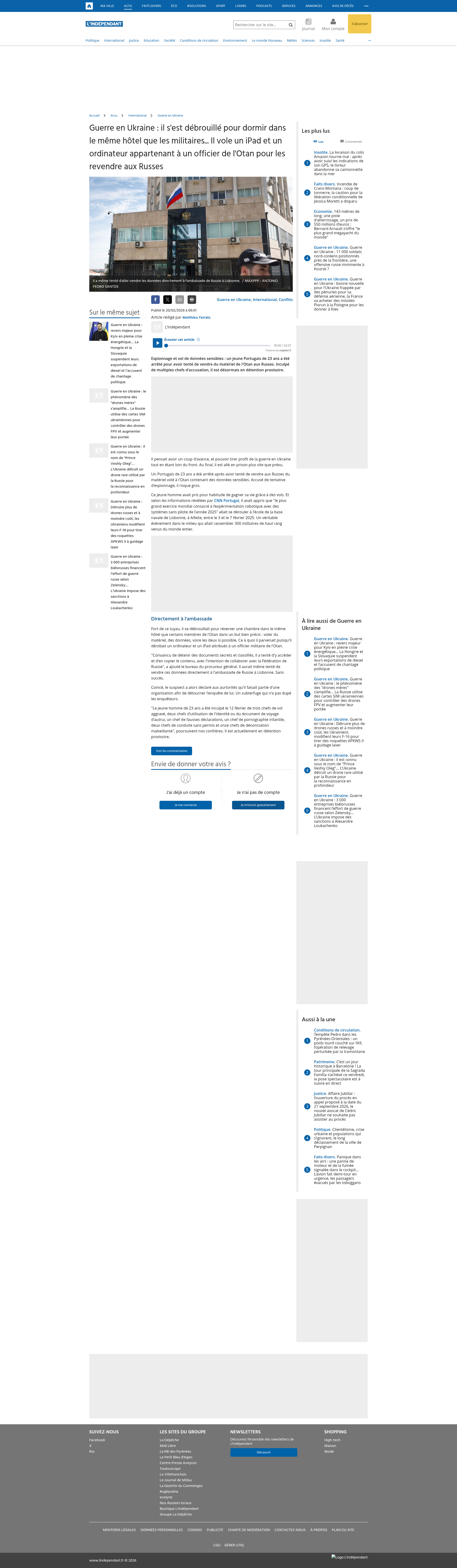 Guerre en Ukraine : il s'est débrouillé pour dormir dans le même hôtel que les militaires... Il vole un iPad et un ordinateur appartenant à un officier de l'Otan pour les revendre aux RussesEspionnage et vol de données sensibles : un jeune Portugais de 23 ans a été arrêté pour avoir tenté de vendre du matériel de l'Otan aux Russes. Inculpé de multiples chefs d'accusation, il est désormais en détention...PNGPDF