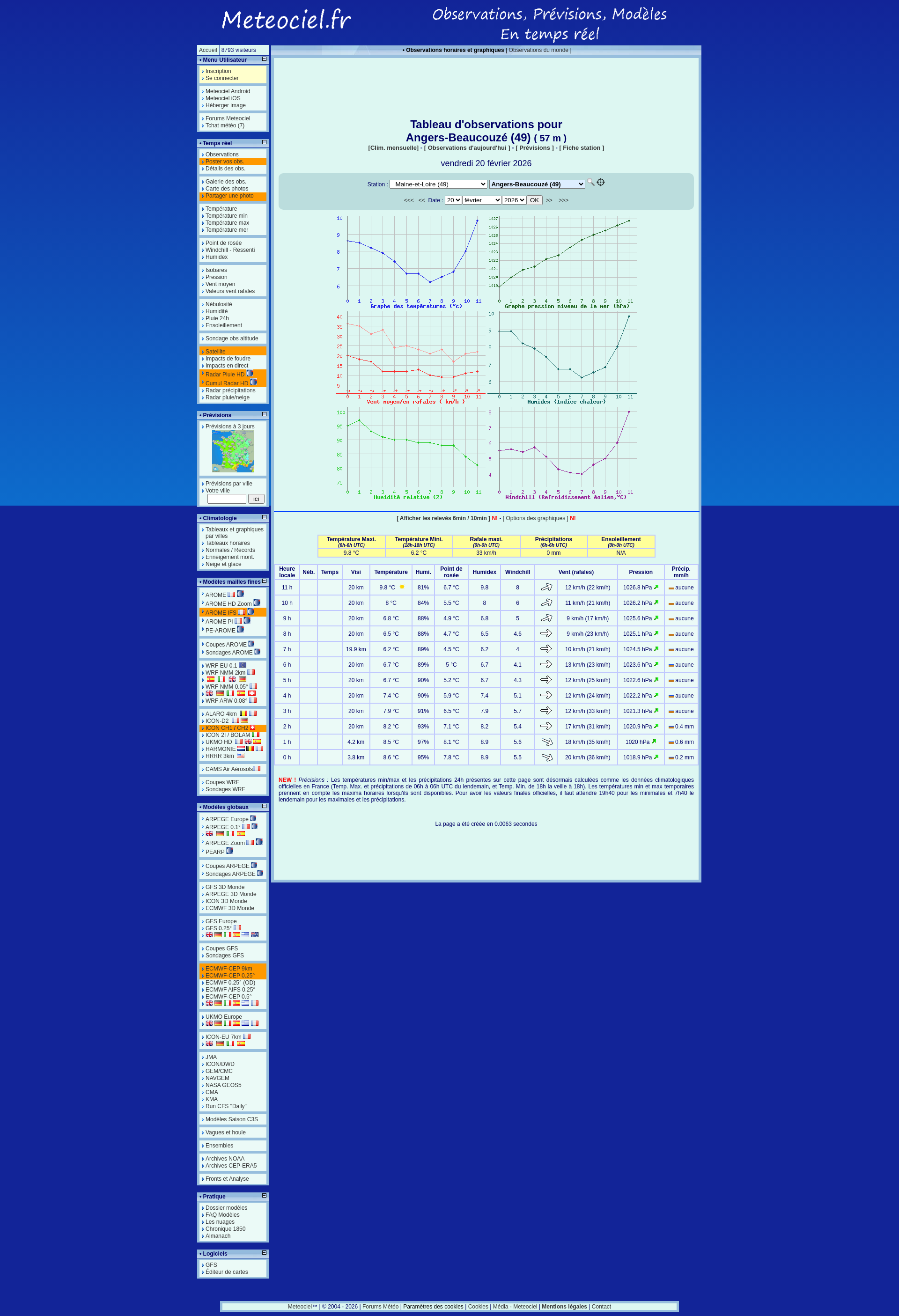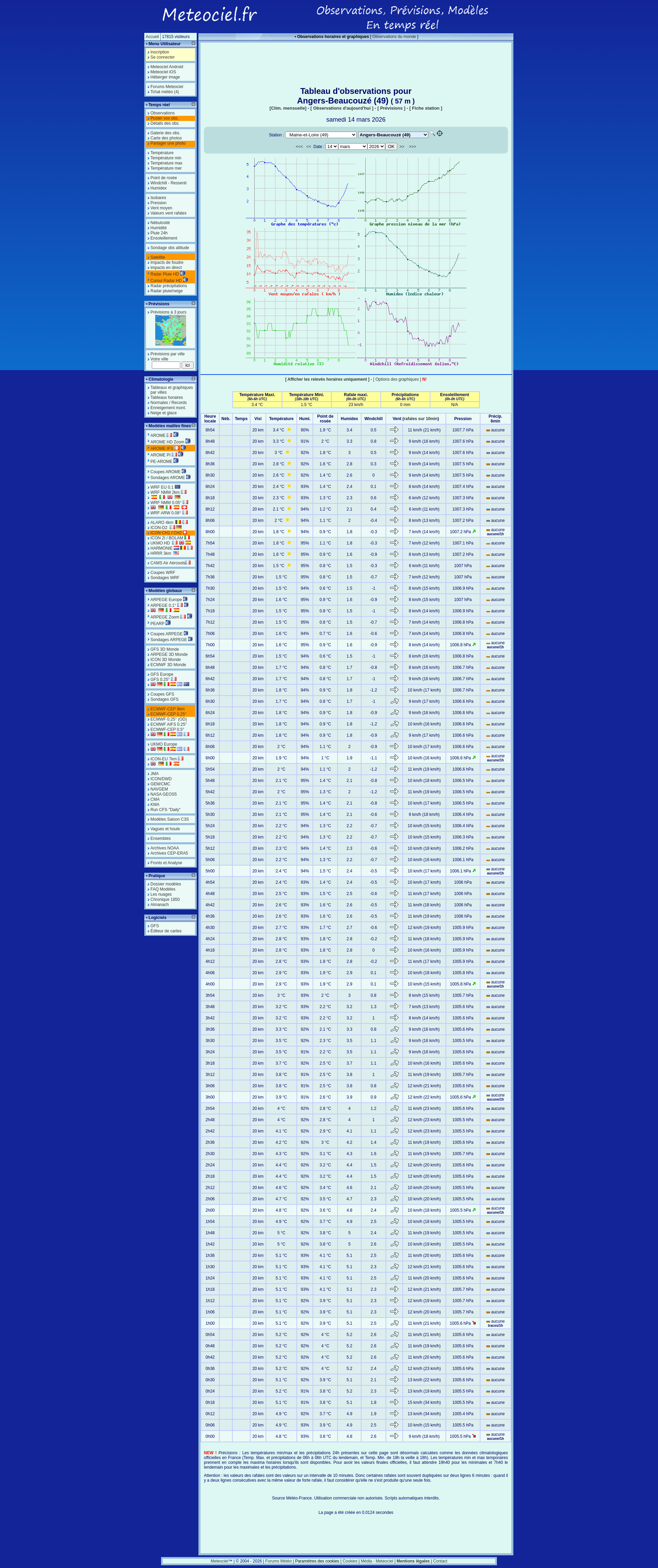 Meteociel - Observations Angers-Beaucouzé (49) - données météo de la station - Tableaux horaires en temps réelRelevés horaires des observations météo de Angers-Beaucouzé (49). Températures, pression, précipitations, vent en temps réel PNGPDF