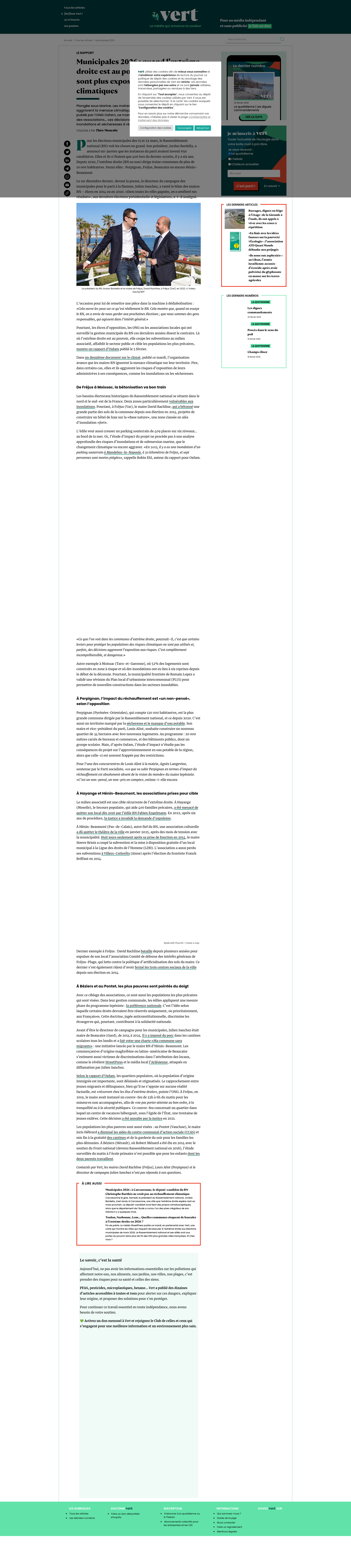 Municipales 2026 : quand l’extrême droite est au pouvoir, les habitants sont plus exposés aux risques climatiquesPlongée sous Marine. Les maires Rassemblement national ignorent voire aggravent la menace climatique sur leur territoire, démontre un rapport publié par l’ONG Oxfam, ce mardi. Bétonisation à tout-va, mise au pas des associations… ces décisions locales empêchent l’adaptation face aux inondations et sécheresses à répétition.PNGPDF