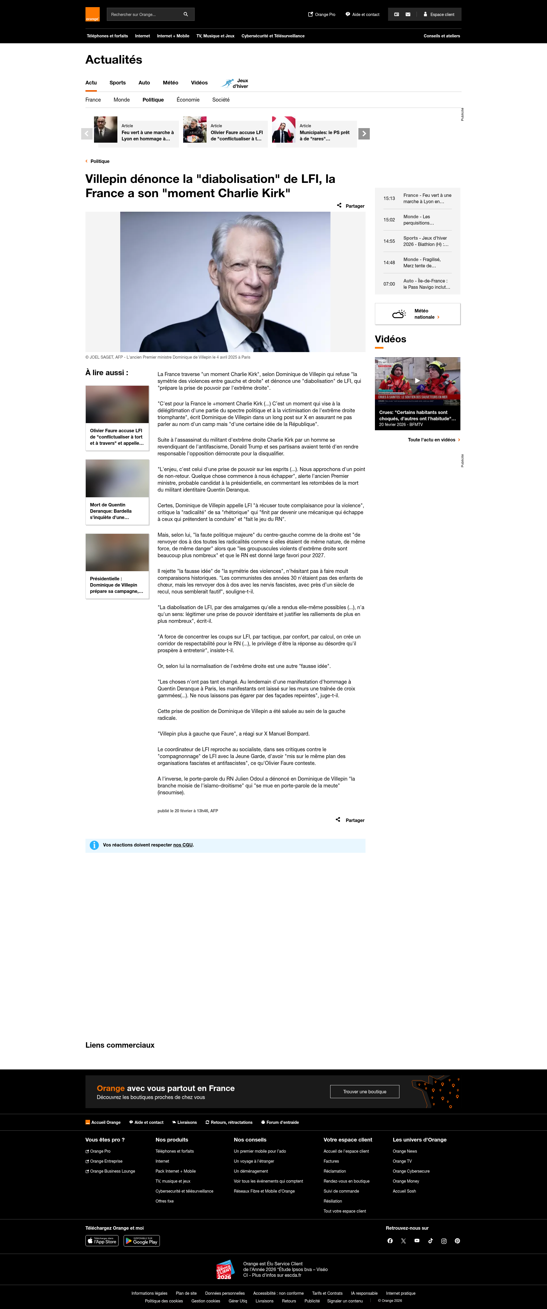 Villepin dénonce la "diabolisation" de LFI, la France a son "moment Charlie Kirk" : Actualités - OrangeLa France traverse "un moment Charlie Kirk", selon Dominique de Villepin qui refuse "la symétrie des violences entre gauche et droite" et dénonce une "diabolisation" de LFI, qui "prépare la prise de pouvoir par l'extrême droite".PNGPDF