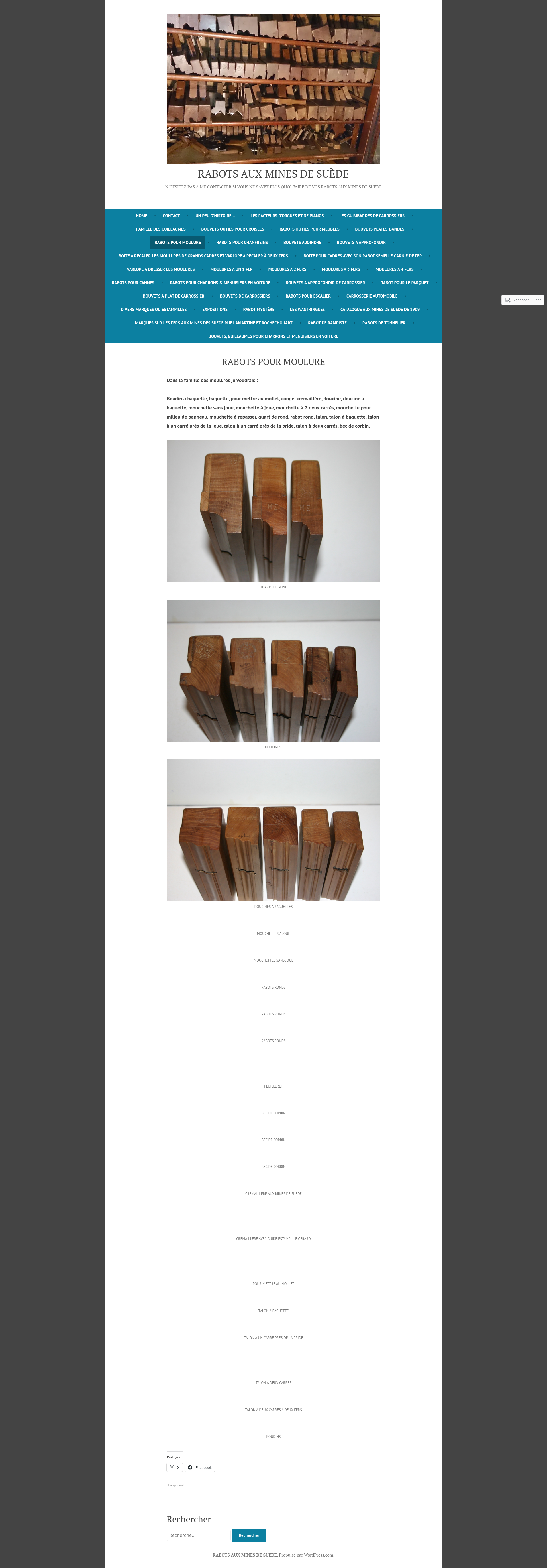 RABOTS POUR MOULUREDans la famille des moulures je voudrais : Boudin a baguette, baguette, pour mettre au mollet, congé, crémaillère, doucine, doucine à baguette, mouchette sans joue, mouchette à joue, mouchette à 2 deux carrés, mouchette pour milieu de panneau, mouchette à repasser, quart de rond, rabot rond, talon, talon à baguette, talon à un carré près…PNGPDF