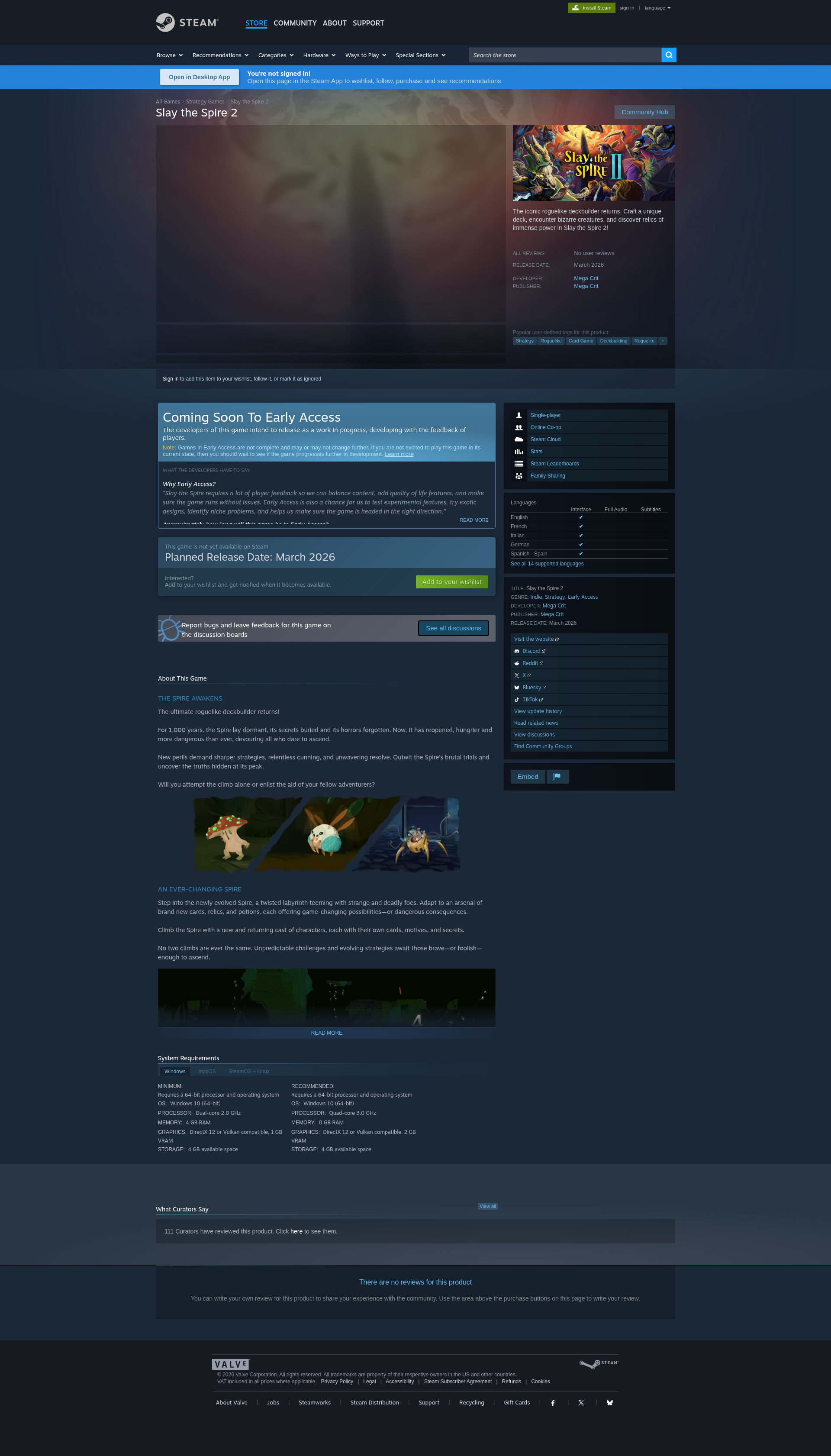 Slay the Spire 2 on SteamThe iconic roguelike deckbuilder returns. Craft a unique deck, encounter bizarre creatures, and discover relics of immense power in Slay the Spire 2!PNGPDF
