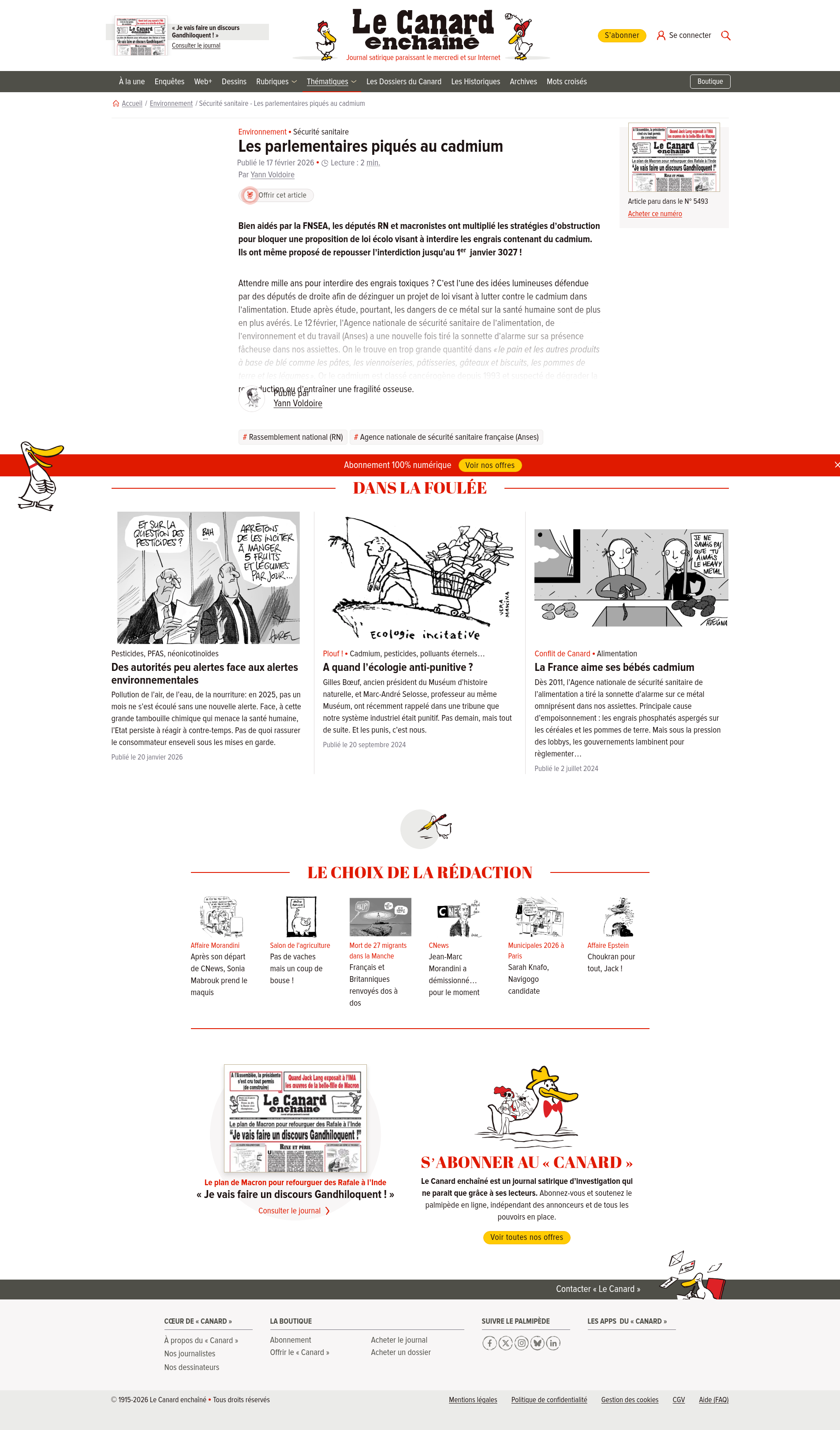 Sécurité sanitaire : Les parlementaires piqués au cadmium | Le Canard enchaînéBien aidés par la FNSEA, les députés RN et macronistes ont multiplié les stratégies d’obstruction pour bloquer une proposition de loi écolo visant à interdire……PNGPDF