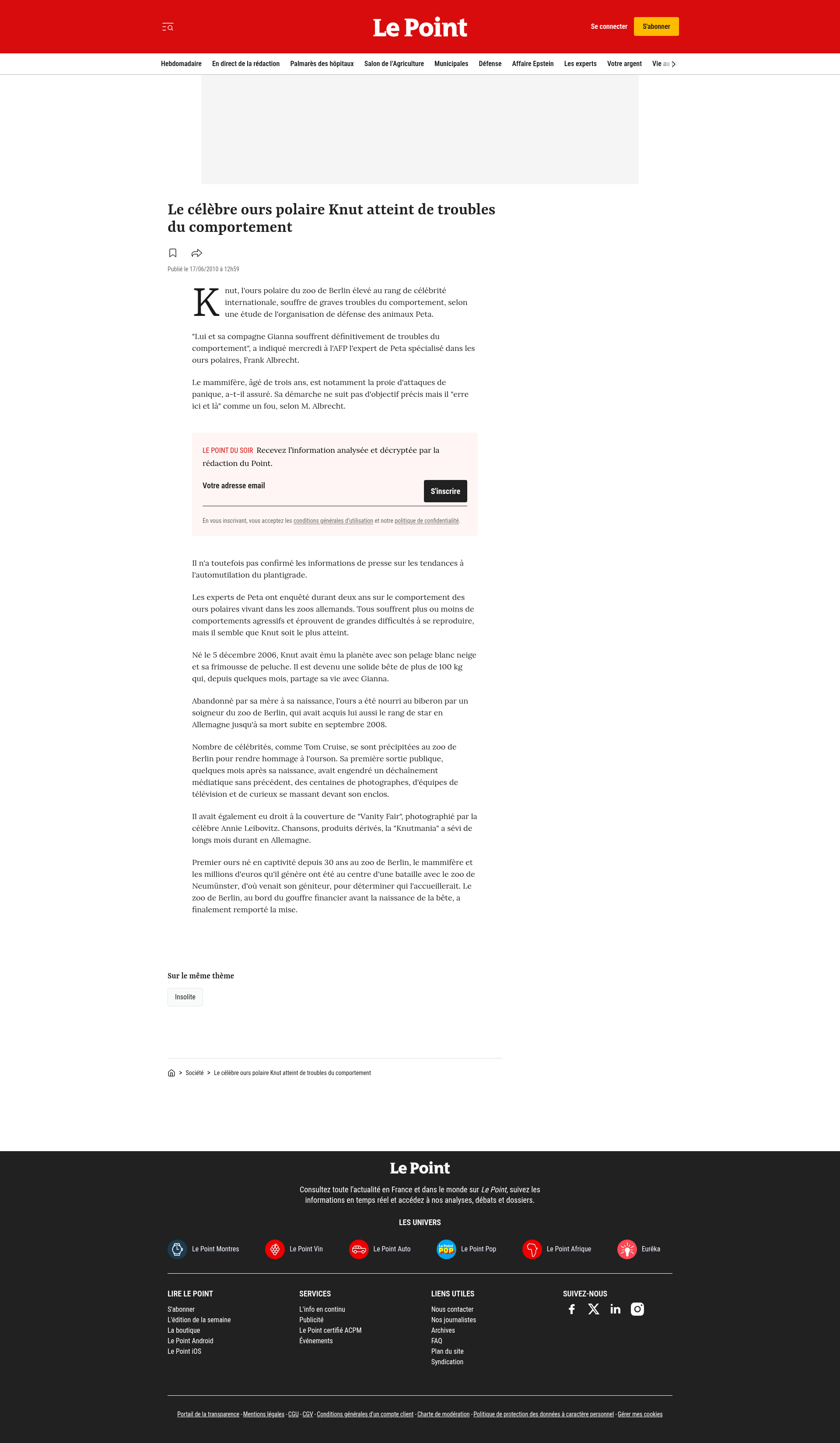 Le célèbre ours polaire Knut atteint de troubles du comportementKnut, l'ours polaire du zoo de Berlin élevé au rang de célébrité internationale, souffre de graves troubles du comportement, selon une étude de l'organisation dPNGPDF