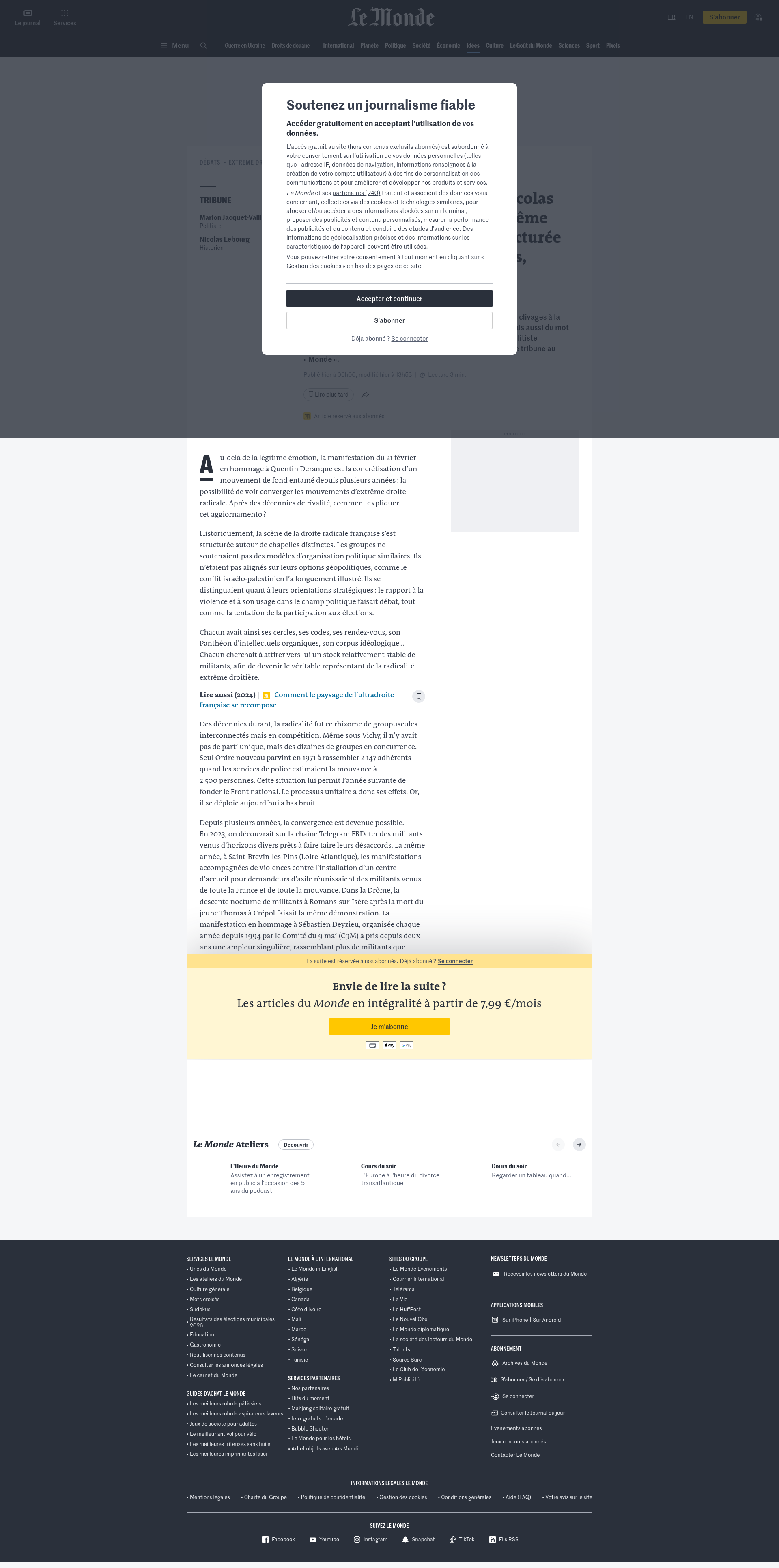 Marion Jacquet-Vaillant et Nicolas Lebourg, chercheurs : « L’extrême droite radicale, jusqu’ici structurée autour de chapelles distinctes, converge dans un national-syncrétisme »TRIBUNE. Longtemps éclaté, le paysage de la droite radicale dépasse ses clivages à la faveur de la numérisation, des dissolutions de mouvements, mais aussi du mot d’ordre fédérateur du « grand remplacement », expliquent la politiste Marion Jacquet-Vaillant et l’historien Nicolas Lebourg, dans une tribune au « Monde ».PNGPDF