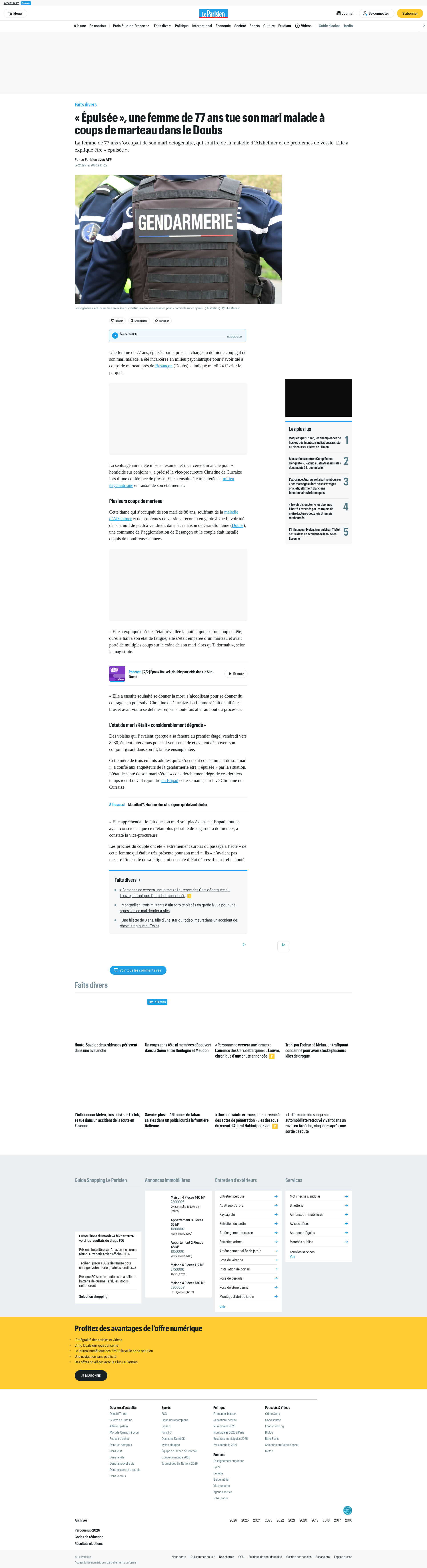 « Épuisée », une femme de 77 ans tue son mari malade à coups de marteau dans le DoubsLa femme de 77 ans s’occupait de son mari octogénaire, qui souffre de la maladie d’Alzheimer et de problèmes de vessie. Elle a expliqué êtrePNGPDF