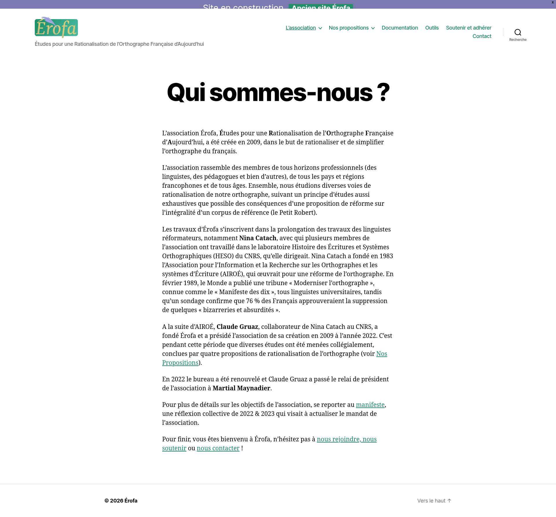 Qui sommes-nous ? - ÉrofaL’association Érofa, Études pour une Rationalisation de l’Orthographe Française d’Aujourd’hui, a été créée en 2009, dans le but de rationaliser et de simplifier l’orthographe du français. L’association rassemble des membres de tous horizons professionnels (des linguistes, des pédagogues et bien d’autres), de tous les pays et régions francophones et de tous âges. Ensemble, nous étudions […]PNGPDF