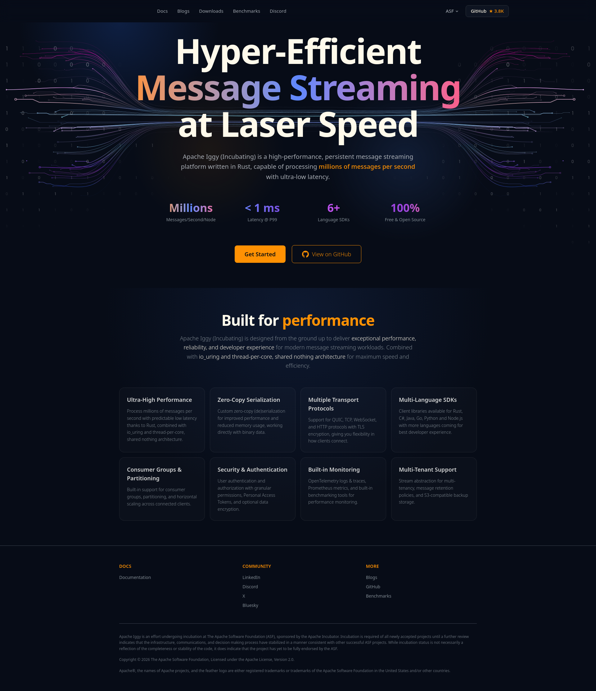Apache Iggy (Incubating) — Hyper-Efficient Message Streaming | Apache IggyApache Iggy (Incubating) is a high-performance, persistent message streaming platform written in Rust, capable of processing millions of messages per second with ultra-low latency.PNGPDF