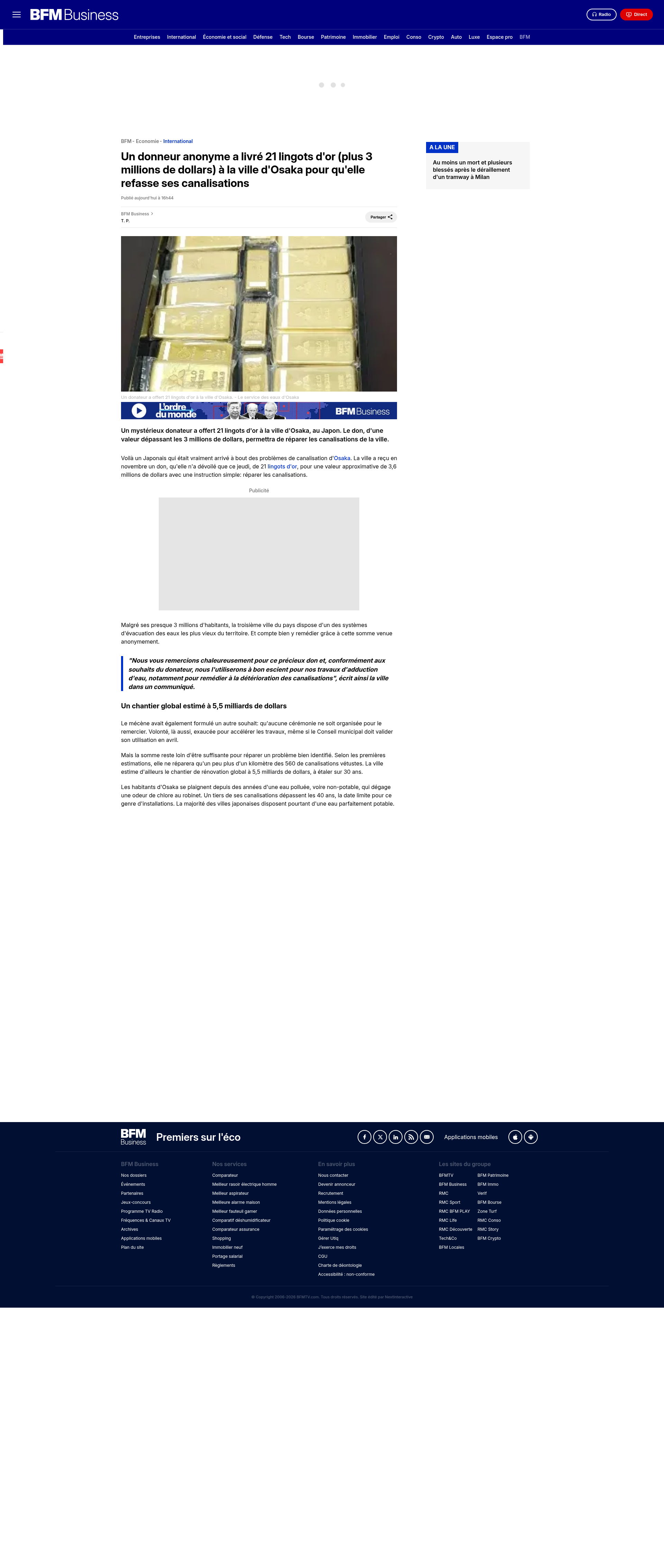 Un donneur anonyme a livré 21 lingots d'or (plus 3 millions de dollars) à la ville d'Osaka pour qu'elle refasse ses canalisationsUn mystérieux donateur a offert 21 lingots d'or à la ville d'Osaka, au Japon. Le don, d'une valeur dépassant les 3 millions de dollars, permettra de réparer les canalisations de la ville.PNGPDF