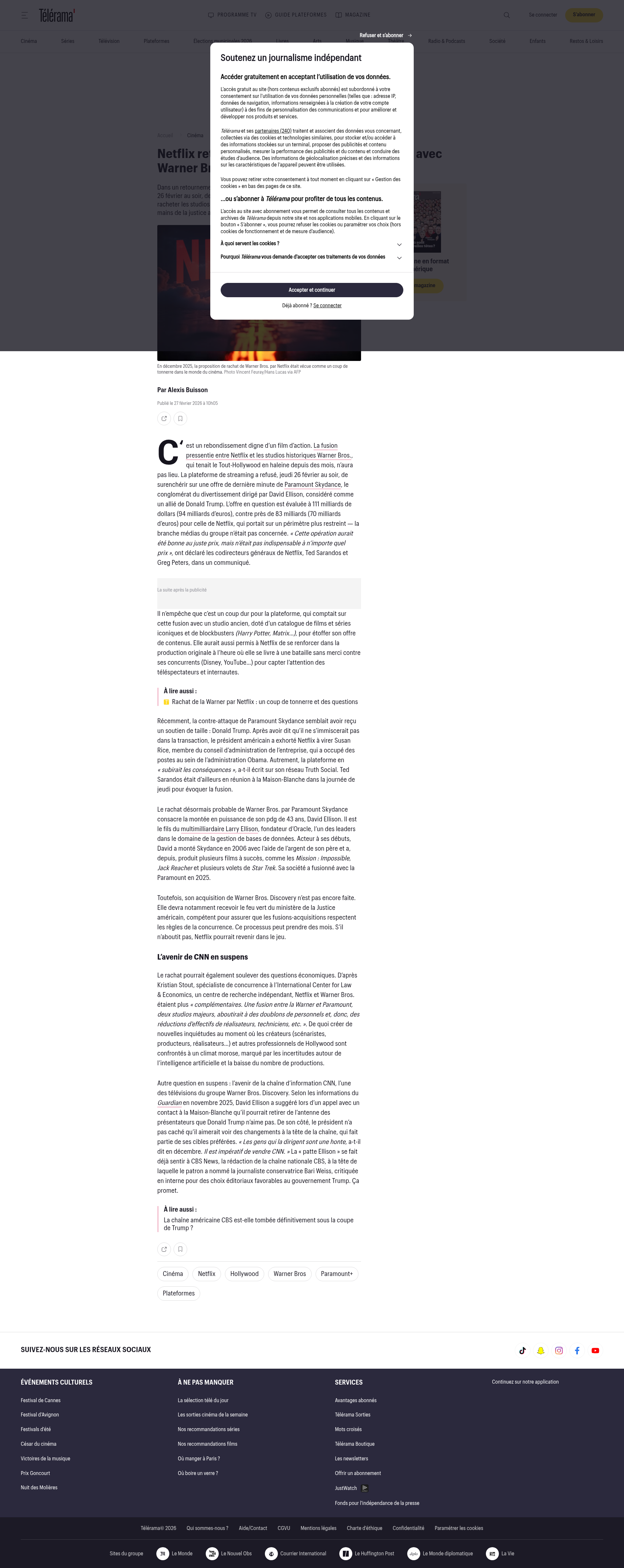 Netflix retire son offre : la fusion très attendue avec Warner Bros. n’aura pas lieuDans un retournement surprise, le géant du streaming a refusé, jeudi 26 février au soir, de contrer une offre de Paramount Skydance pour racheter les studios mythiques. Le dossier doit maintenant passer entre les mains de la justice américaine pour être validé.PNGPDF