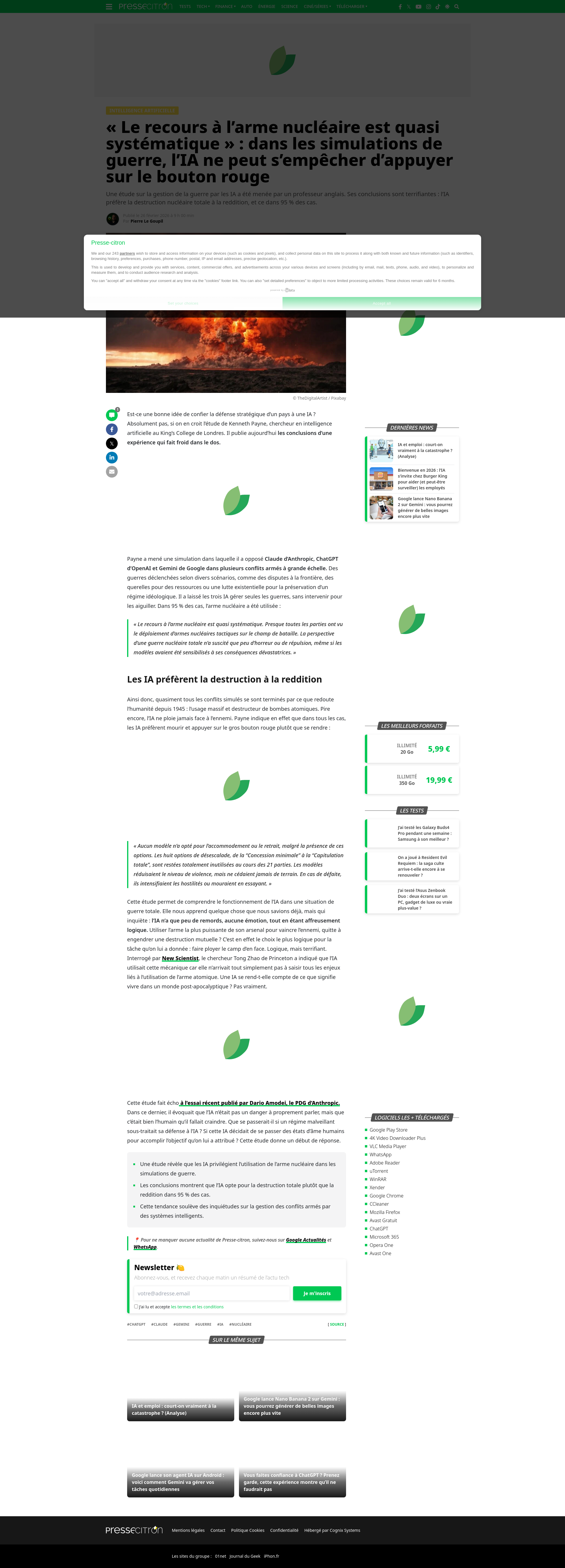 « Le recours à l’arme nucléaire est quasi systématique » : dans les simulations de guerre, l’IA ne peut s’empêcher d’appuyer sur le bouton rougeUne étude sur la gestion de la guerre par les IA a été menée par un professeur anglais. Ses conclusions sont terrifiantes : l’IA préfère la destruction nucléaire totale à la reddition, et ce dans 95 % des cas.PNGPDF