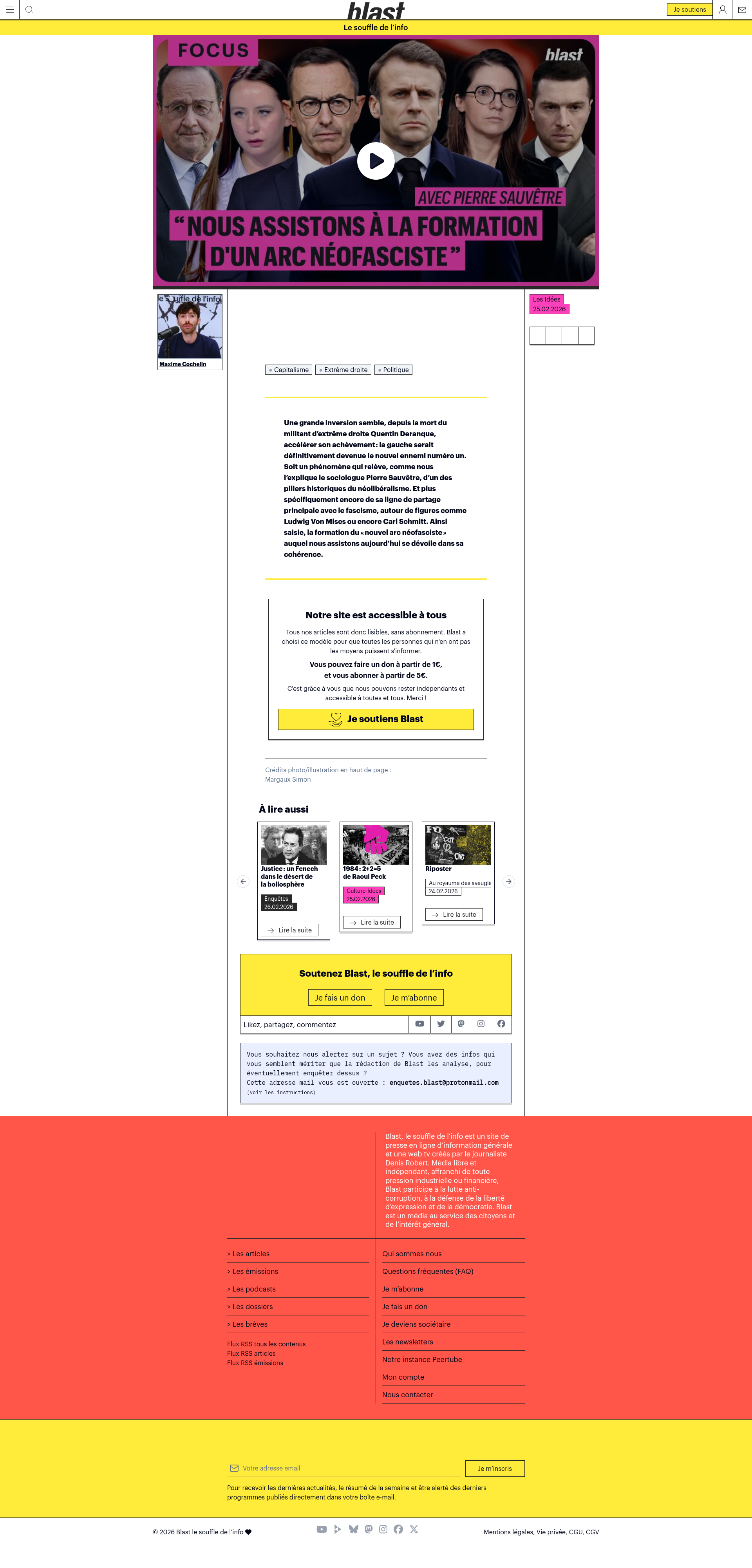 "Nous assistons à la formation d'un arc néofasciste"Une grande inversion semble, depuis la mort du militant d’extrême droite Quentin Deranque, accélérer son achèvement : la gauche serait définitivement devenue le nouvel ennemi numéro un. Soit un phénomène qui relève, comme nous l’explique le sociologue…PNGPDF