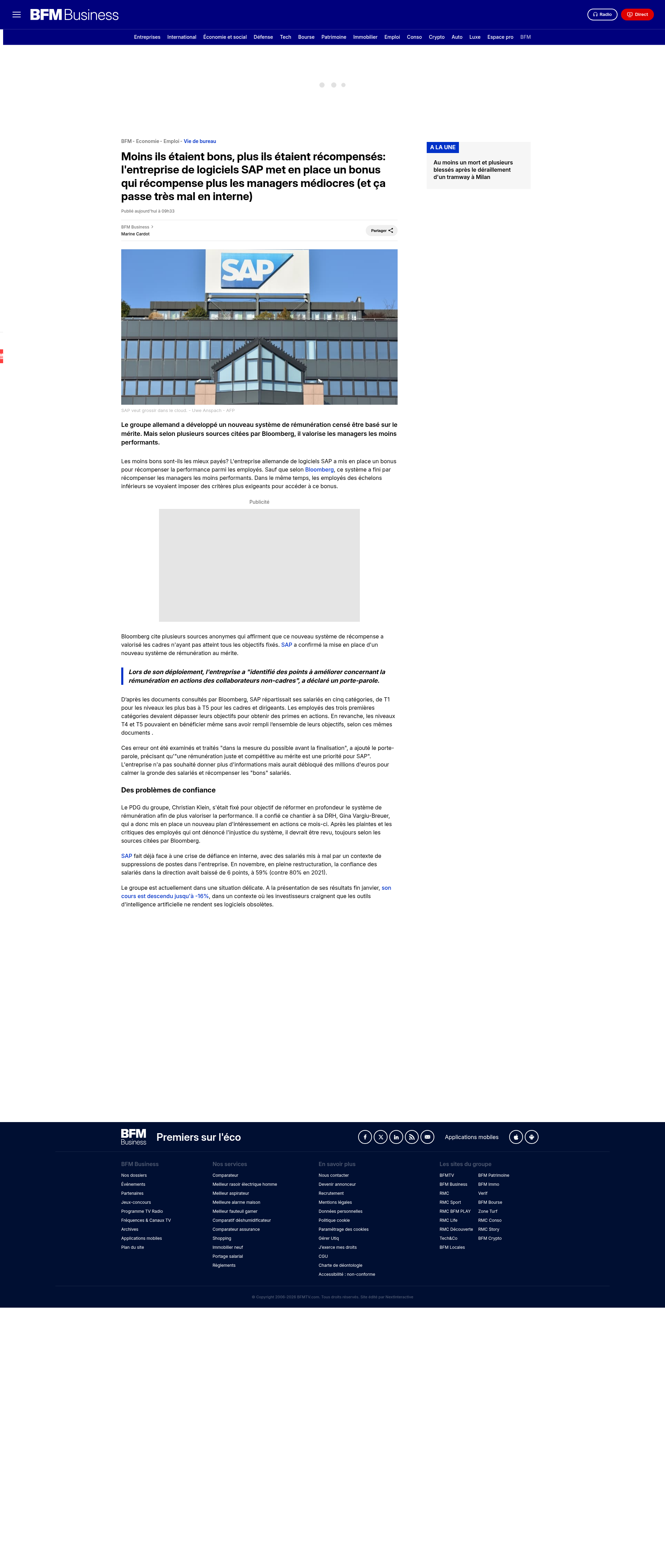 Moins ils étaient bons, plus ils étaient récompensés: l'entreprise de logiciels SAP met en place un bonus qui récompense plus les managers médiocres (et ça passe très mal en interne)Le groupe allemand a développé un nouveau système de rémunération censé être basé sur le mérite. Mais selon plusieurs sources citées par Bloomberg, il valorise les managers les moins performants.PNGPDF