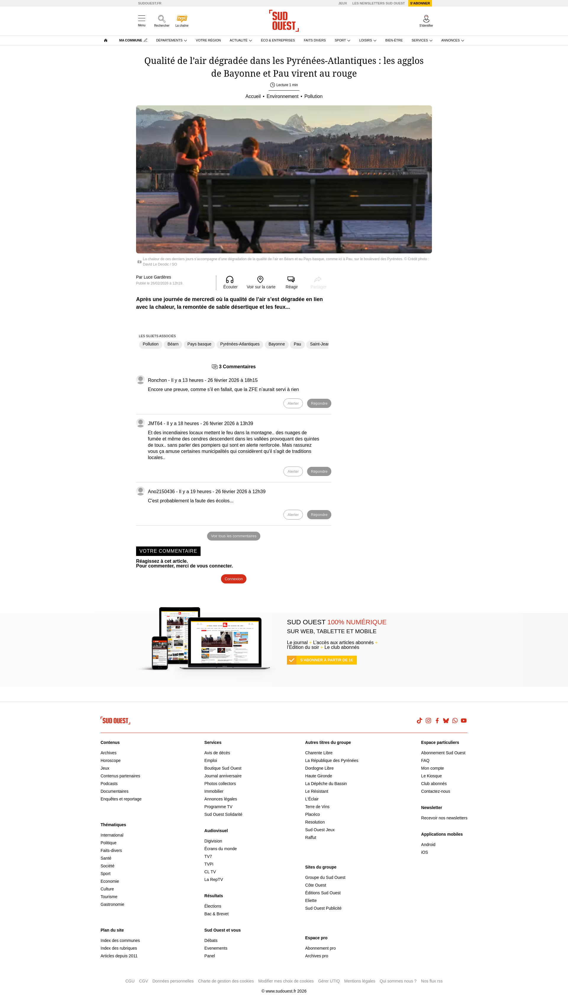 Qualité de l’air dégradée dans les Pyrénées-Atlantiques : les agglos de Bayonne et Pau virent au rougeAprès une journée de mercredi où la qualité de l’air s’est dégradée en lien avec la chaleur, la remontée de sable désertique et les feux pastoraux - entre autres -, l’indice Atmo passe à « mauvais » ce jeudi 26 février autour de Bayonne et de Pau notammentPNGPDF