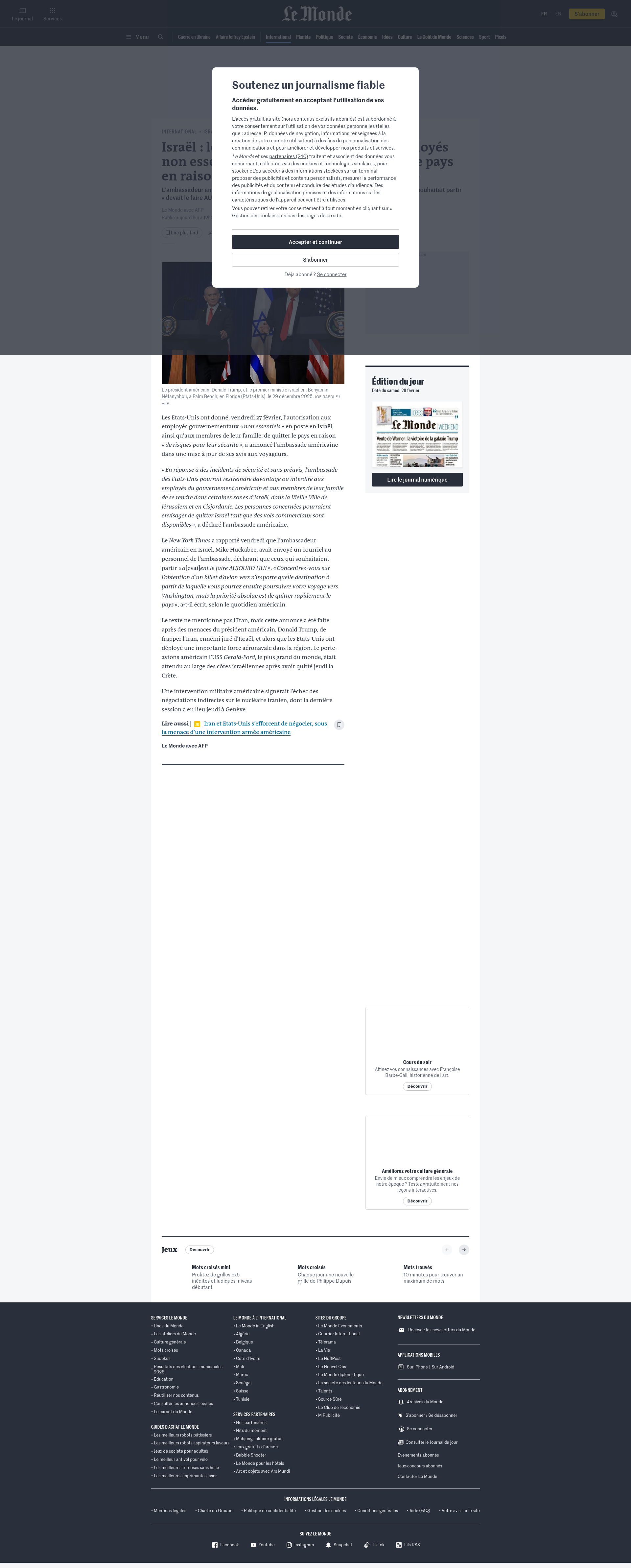 Israël : les Etats-Unis appellent leurs employés non essentiels à « envisager de quitter » le pays en raison « de risques pour leur sécurité »L’ambassadeur américain en Israël, Mike Huckabee, a dit que le personnel de l’ambassade qui souhaitait partir « devait le faire AUJOURD’HUI », selon le « New York Times ».PNGPDF