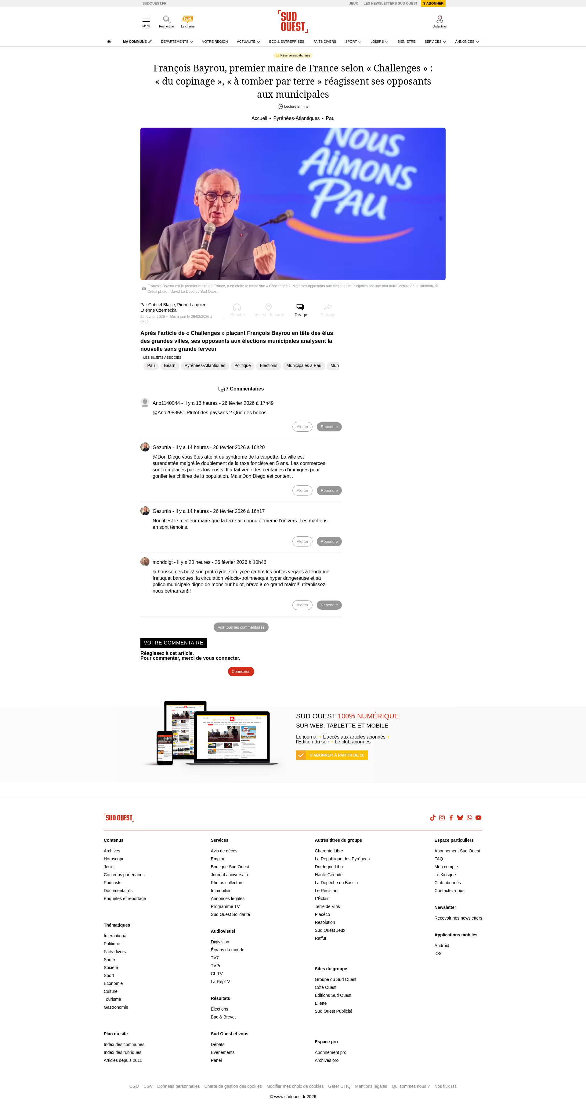 François Bayrou, premier maire de France selon « Challenges » : « du copinage », « à tomber par terre » réagissent ses opposants aux municipalesAprès l’article de « Challenges » plaçant François Bayrou en tête des élus des grandes villes, ses opposants aux élections municipales analysent la nouvelle sans grande ferveurPNGPDF