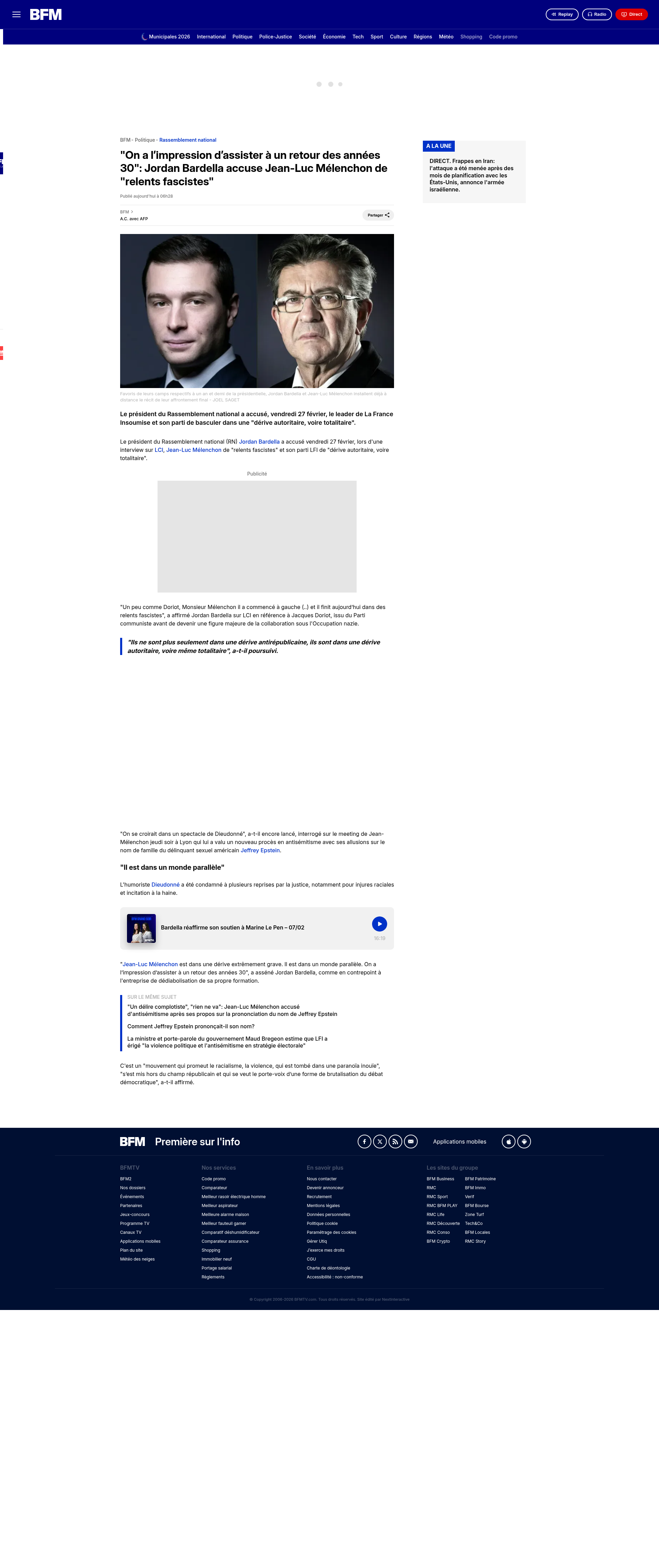 "On a l’impression d’assister à un retour des années 30": Jordan Bardella accuse Jean-Luc Mélenchon de "relents fascistes"Le président du Rassemblement national a accusé, vendredi 27 février, le leader de La France Insoumise et son parti de basculer dans une "dérive autoritaire, voire totalitaire". PNGPDF