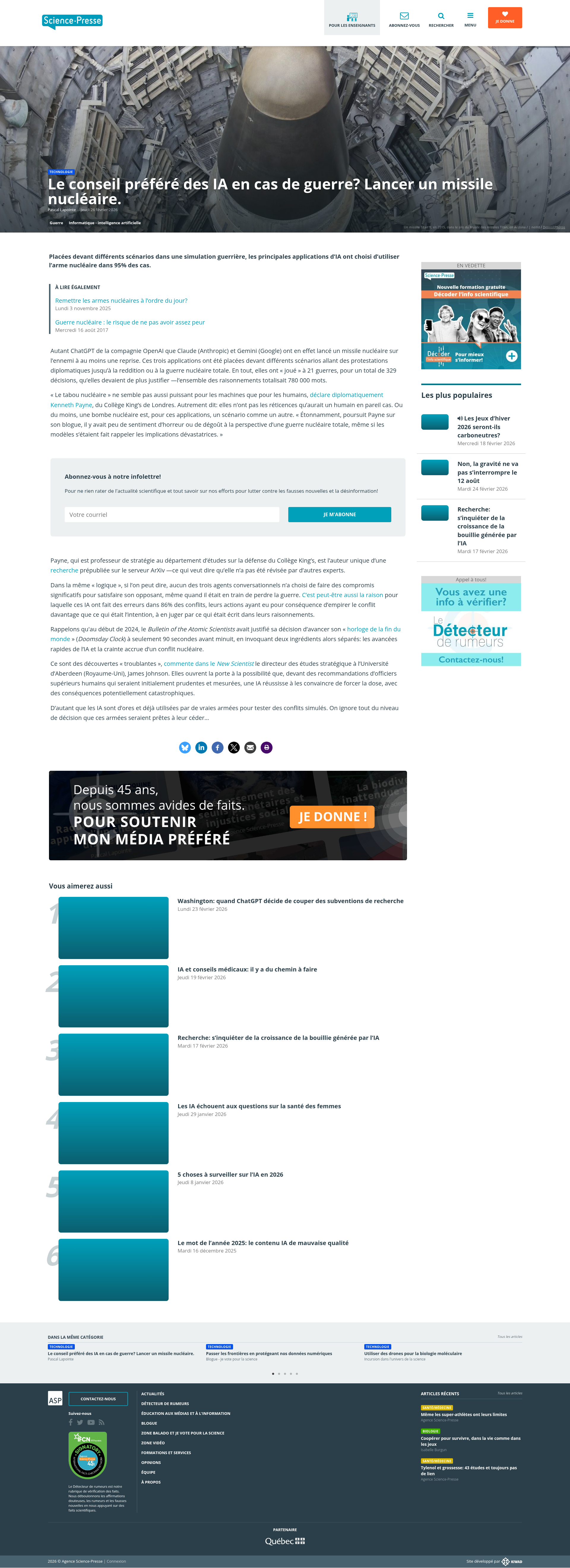 Le conseil préféré des IA en cas de guerre? Lancer un missile nucléaire.Placées devant différents scénarios dans une simulation de jeu de guerre, les principales applications d’IA ont choisi d’utiliser l’arme nucléaire dans 95% des cas.PNGPDF