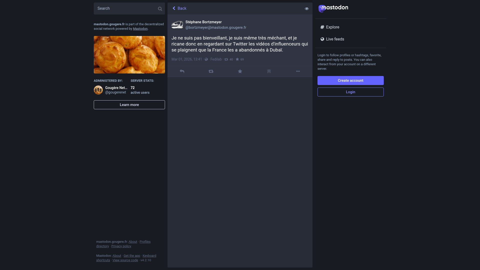 Stéphane Bortzmeyer (@bortzmeyer@mastodon.gougere.fr)Je ne suis pas bienveillant, je suis même très méchant, et je ricane donc en regardant sur Twitter les vidéos d'influenceurs qui se plaignent que la France les a abandonnés à Dubaï.PNGPDF