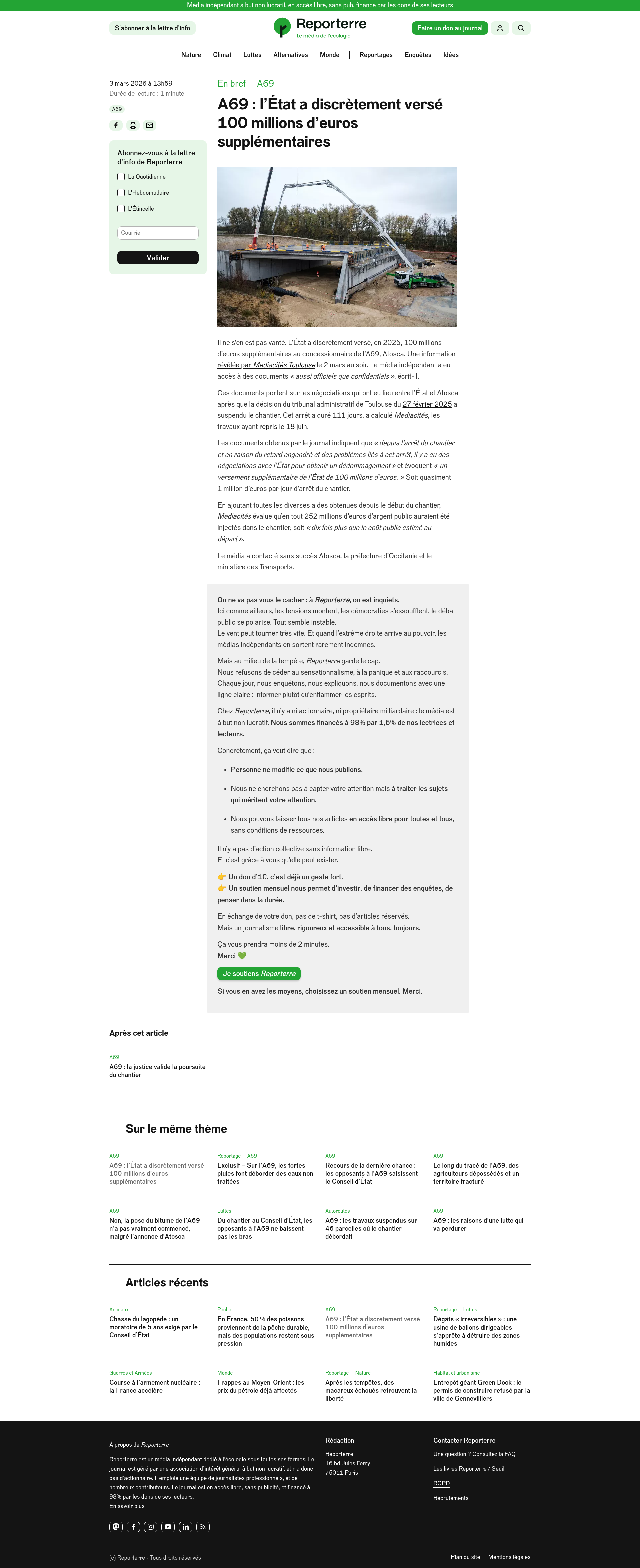 A69 : l’État a discrètement versé 100 millions d’euros supplémentaires Il ne s’en est pas vanté. L’État a discrètement versé, en 2025, 100 millions d’euros supplémentaires au concessionnaire de l’A69, Atosca. Une information révélée par Mediacités Toulouse le 2 mars au soir. Le média indépendant a eu accès à des documents « aussi officiels que confidentiels », écrit-il. PNGPDF