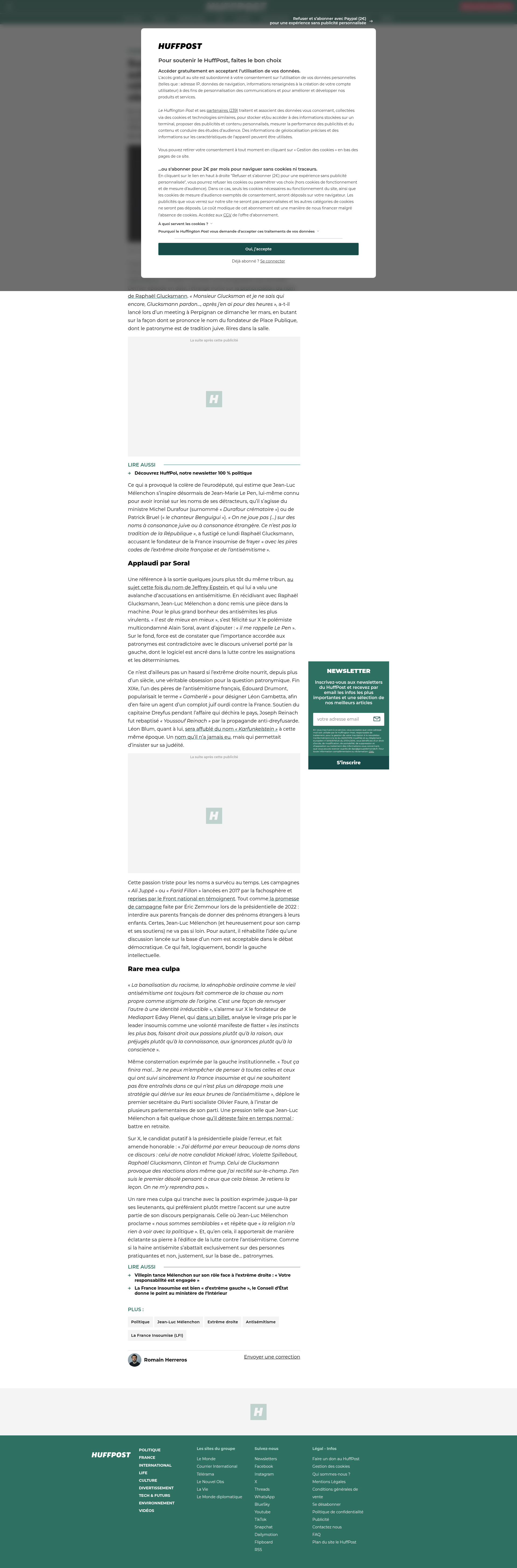 Sur les noms de ses adversaires, Mélenchon réhabilite une obsession de l’extrême droiteEn butant sur le nom de Raphaël Glucksmann, et en ironisant derrière, le fondateur de LFI intègre dans le débat des codes contraires au projet de la gauche.PNGPDF