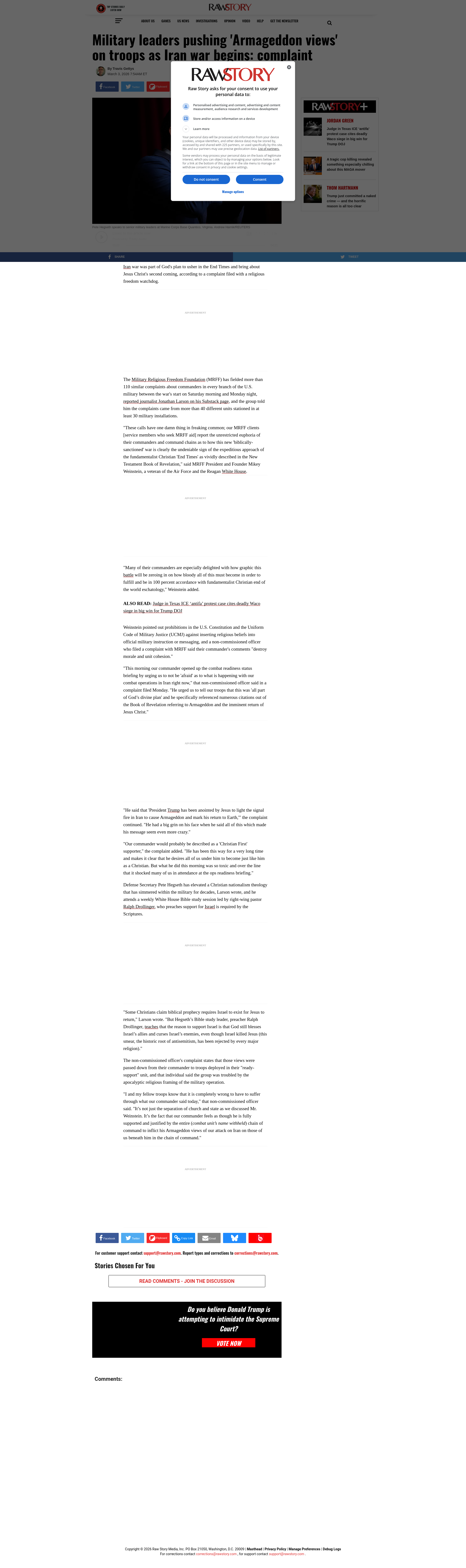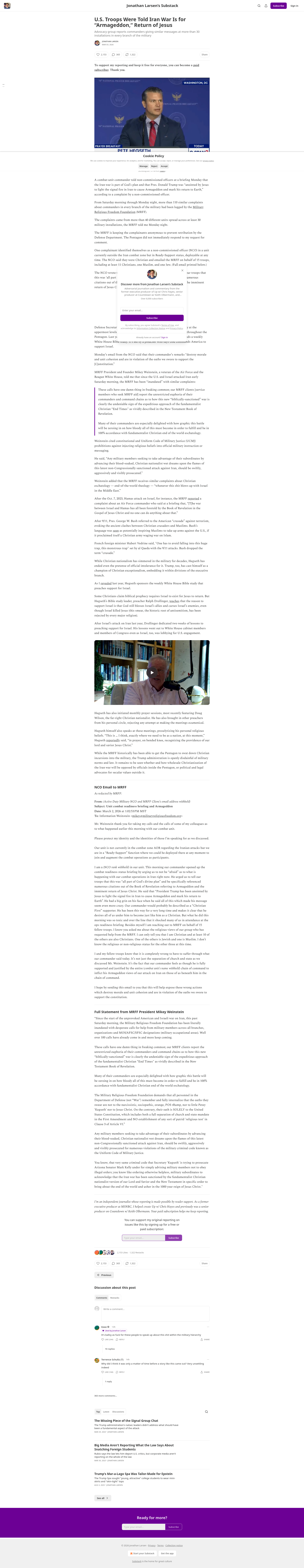 Military leaders pushing 'Armageddon views' on troops as Iran war begins: complaintA combat-unit commander told non-commissioned officers Monday that the Iran war was part of God's plan to usher in the End Times and bring about Jesus Christ's second coming, according to a complaint filed with a religious freedom watchdog.The Military Religious Freedom Foundation (MRFF) has fielded...PNGPDF