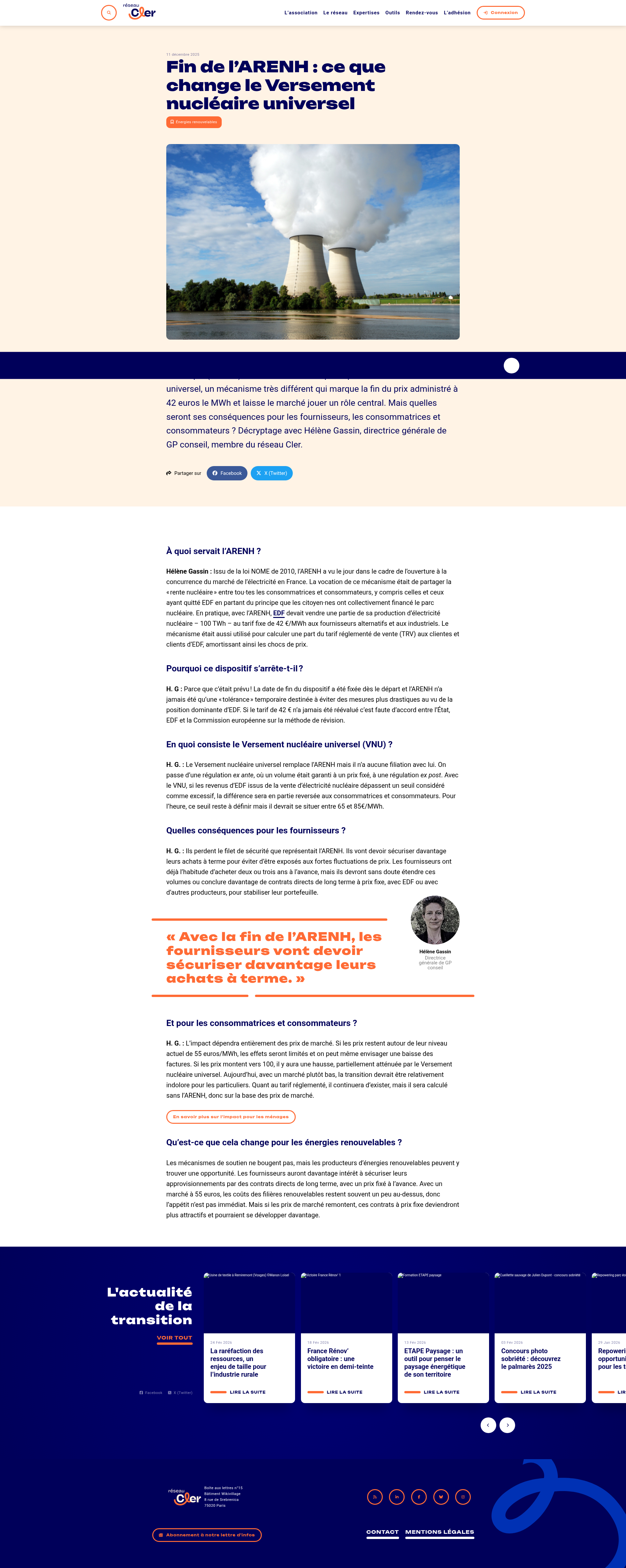 Fin de l’ARENH : ce que change le Versement nucléaire universelLe 1er janvier 2026 a marqué la fin de l’Accès régulé à l’électricité nucléaire historique (ARENH). Il est désormais remplacé par le Versement nucléaire universel, un mécanisme très différent qui marque la fin du prix administré à 42 euros le MWh et laisse le marché jouer un rôle central. Mais quelles seront ses conséquences pour les fournisseurs, les consommatrices et consommateurs ? Décryptage avec Hélène Gassin, directrice générale de GP conseil, membre du réseau Cler. PNGPDF