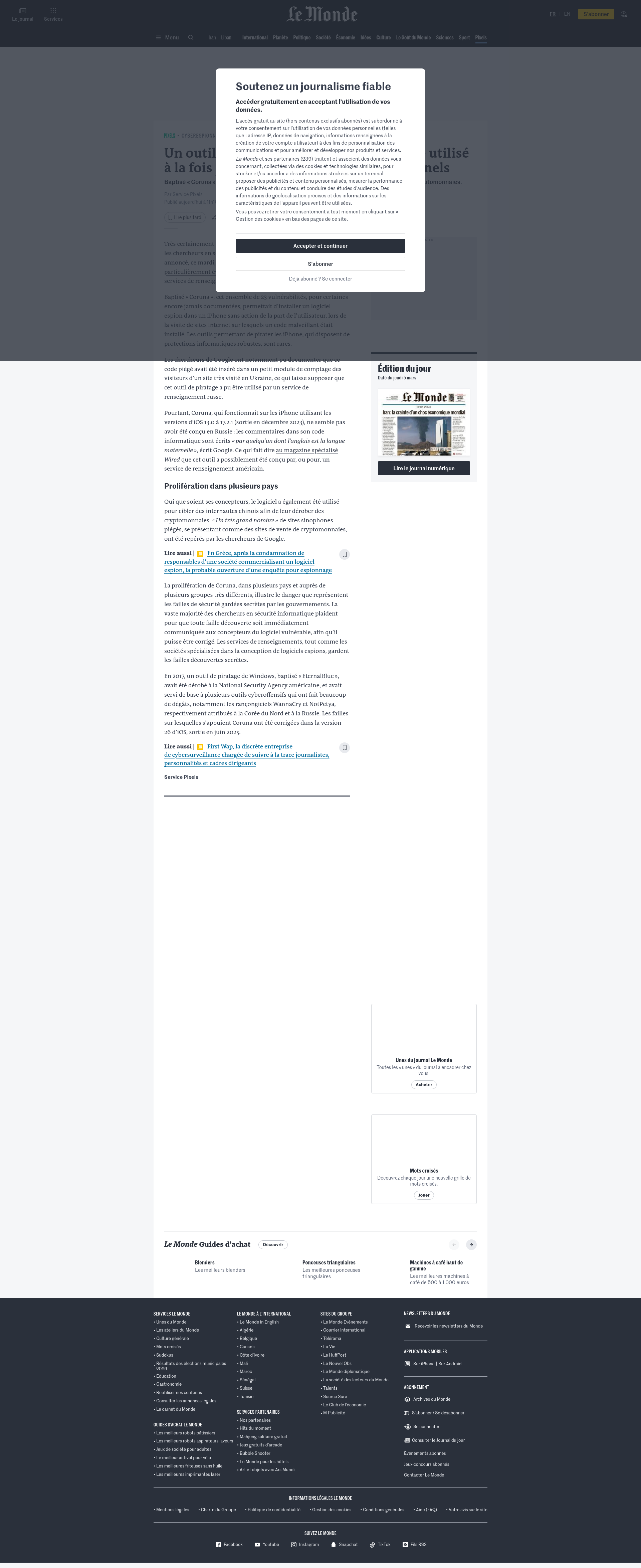 Un outil de piratage d’iPhone très élaboré utilisé à la fois par des espions et des cybercriminelsBaptisé « Coruna », cet outil a visé aussi bien des Ukrainiens que des détenteurs chinois de cryptomonnaies.PNGPDF