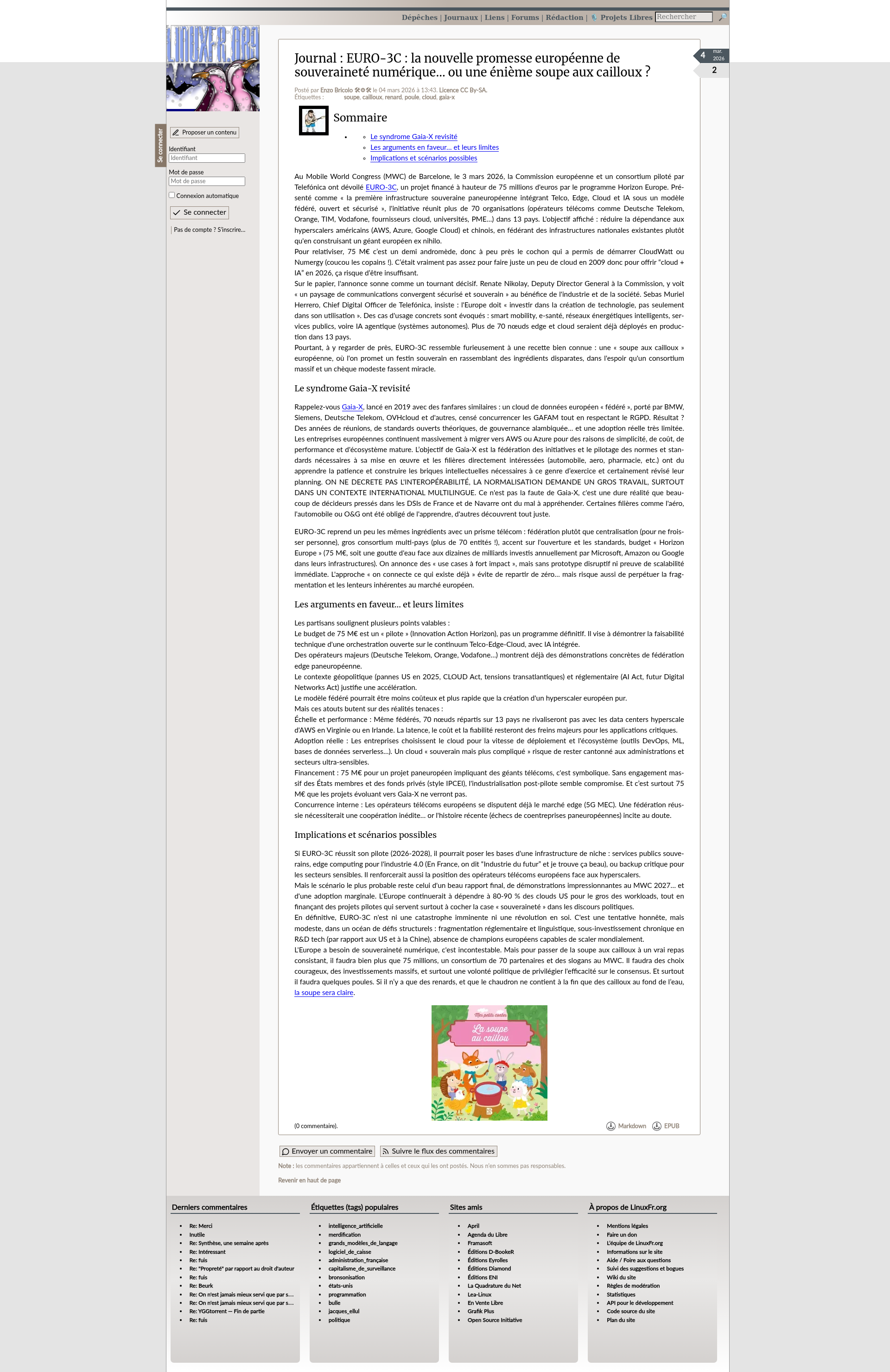 EURO-3C : la nouvelle promesse européenne de souveraineté numérique… ou une énième soupe aux cailloux ? - LinuxFr.orgEURO-3C : la nouvelle promesse européenne de souveraineté numérique… ou une énième soupe aux cailloux ?PNGPDF