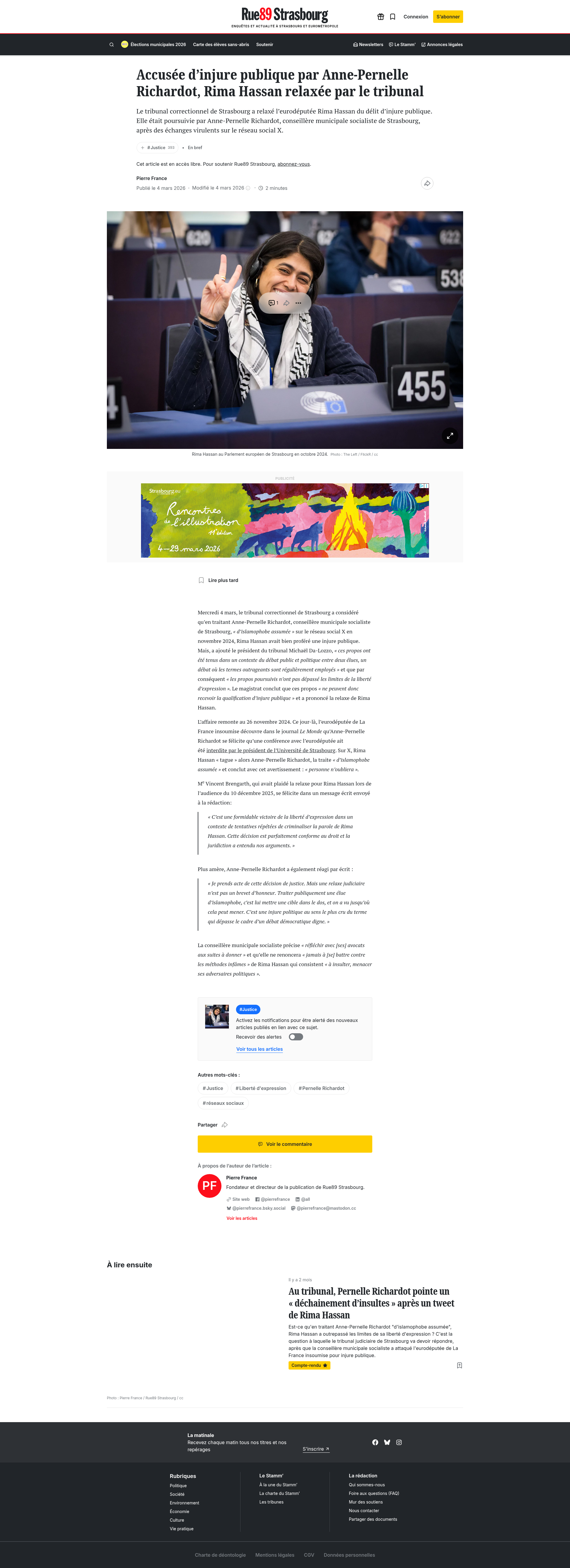 Accusée d'injure publique par Anne-Pernelle Richardot, Rima Hassan relaxée par le tribunalLa conseillère municipale socialiste de Strasbourg Anne-Pernelle Richardot a poursuivi l'eurodéputée Rima Hassan pour un tweet de novembre 2024 la qualifiant "d'islamophobe assumée".PNGPDF