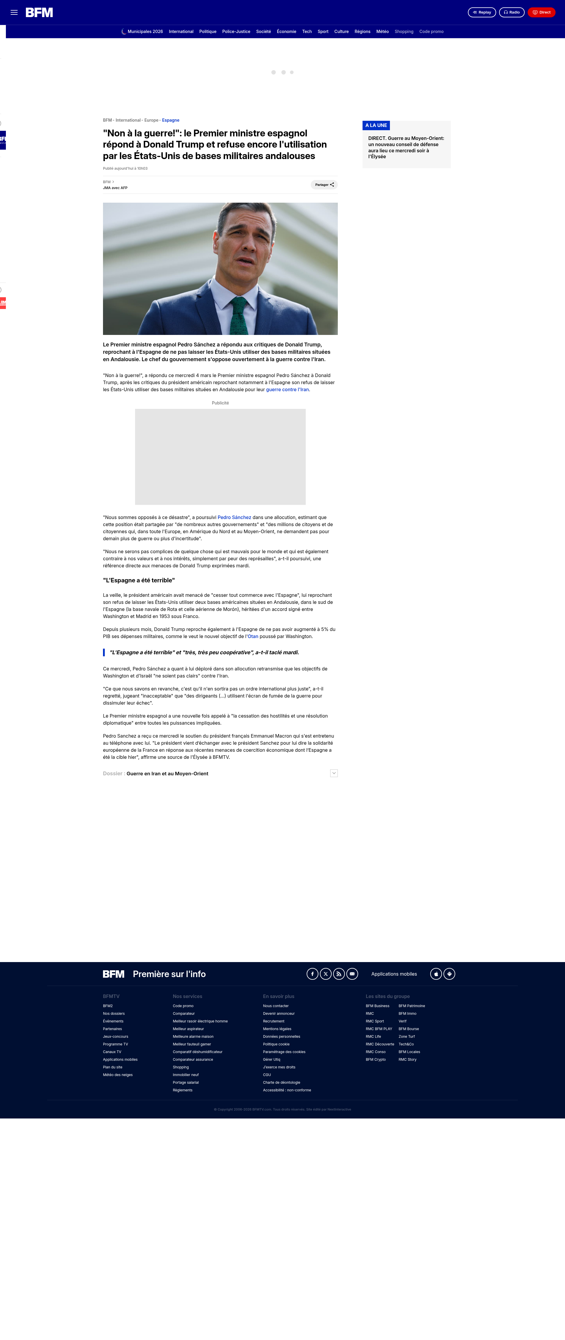 "Non à la guerre!": le Premier ministre espagnol répond à Donald Trump et refuse encore l'utilisation par les États-Unis de bases militaires andalousesLe Premier ministre espagnol Pedro Sánchez a répondu aux critiques de Donald Trump, reprochant à l'Espagne de ne pas laisser les États-Unis utiliser des bases militaires situées en Andalousie. Le chef du gouvernement s'oppose ouvertement à la guerre contre l'Iran.PNGPDF