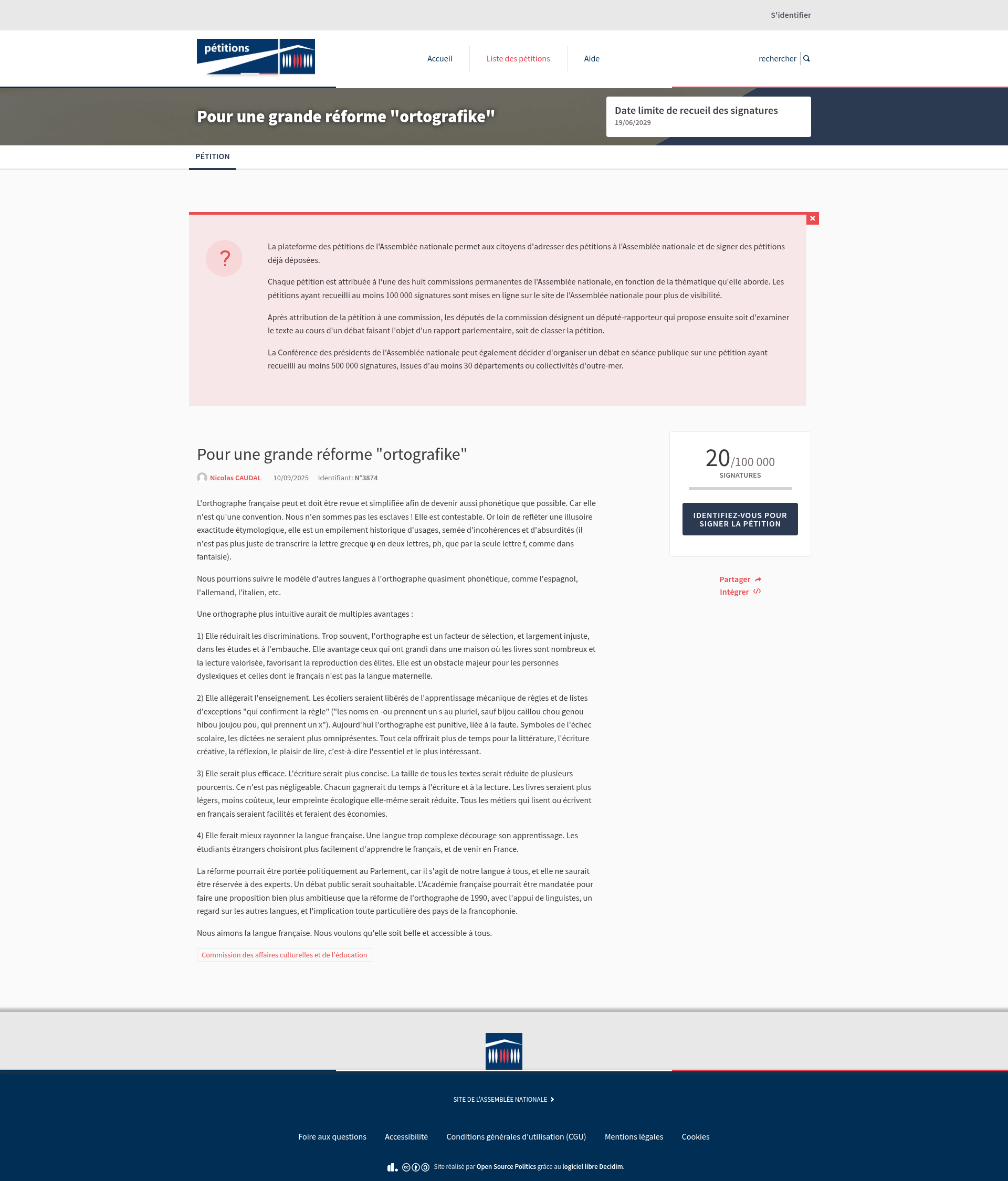 Pour une grande réforme "ortografike" - Pour une grande réforme "ortografike" - Plateforme des pétitions de l’Assemblée nationaleL'orthographe française peut et doit être revue et simplifiée afin de devenir aussi phonétique que possible. Car elle n'est qu'une convention. Nous n'en sommes pas les esclaves ! Elle est contestable. Or loin de refléter une illusoire exactitude étymologique, elle est un empilement historique d'usages, semée d'incohérences et d'absurdités (il n'est pas plus juste de transcrire la lettre grecque φ en deux lettres, ph, que par la seule lettre f, comme dans fantaisie). Nous pourrions suivre le modèle d'autres langues à l'orthographe quasiment phonétique, comme l'espagnol, l'allemand, l'italien, etc. Une orthographe plus intuitive aurait de multiples avantages : 1) Elle réduirait les discriminations. Trop souvent, l'orthographe est un facteur de sélection, et largement injuste, dans les études et à l'embauche. Elle avantage ceux qui ont grandi dans une maison où les livres sont nombreux et la lecture valorisée, favorisant la reproduction des élites. Elle est un obstacle majeur pour les personnes dyslexiques et celles dont le français n'est pas la langue maternelle. 2) Elle allégerait l'enseignement. Les écoliers seraient libérés de l'apprentissage mécanique de règles et de listes d'exceptions "qui confirment la règle" ("les noms en -ou prennent un s au pluriel, sauf bijou caillou chou genou hibou joujou pou, qui prennent un x"). Aujourd'hui l'orthographe est punitive, liée à la faute. Symboles de l'échec scolaire, les dictées ne seraient plus omniprésentes. Tout cela offrirait plus de temps pour la littérature, l'écriture créative, la réflexion, le plaisir de lire, c'est-à-dire l'essentiel et le plus intéressant. 3) Elle serait plus efficace. L'écriture serait plus concise. La taille de tous les textes serait réduite de plusieurs pourcents. Ce n'est pas négligeable. Chacun gagnerait du temps à l'écriture et à la lecture. Les livres seraient plus légers, moins coûteux, leur empreinte écologique elle-même serait réduite. Tous les métiers qui lisent ou écrivent en français seraient facilités et feraient PNGPDF