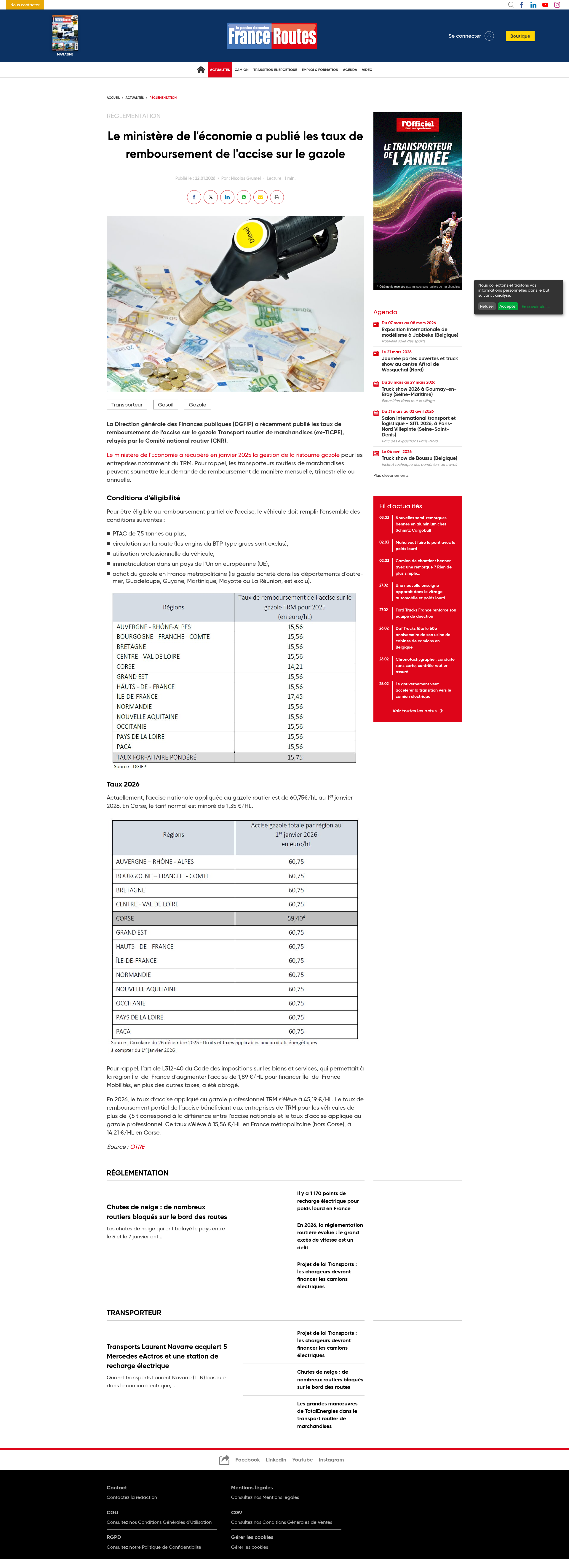 Le ministère de l'économie a publié les taux de remboursement de l'accise sur le gazoleLa Direction générale des Finances publiques (DGFIP) a récemment publié les taux de remboursement de l’accise sur le gazole Transport routier de marchandises (ex-TICPE), relayés par le Comité national routier (CNR). - FranceRoutesPNGPDF