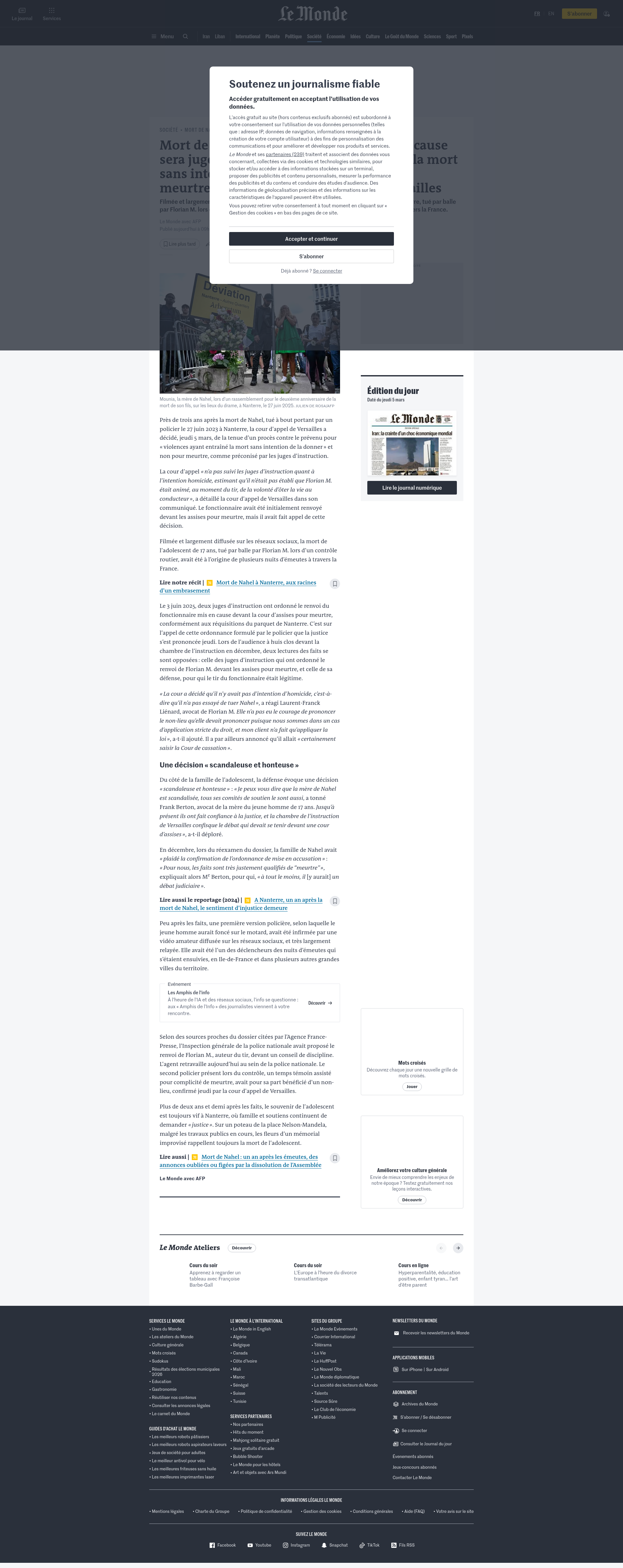Mort de Nahel en 2023 : le policier mis en cause sera jugé pour « violences ayant entraîné la mort sans intention de la donner » et non pour meurtre, ordonne la cour d’appel de VersaillesFilmée et largement diffusée sur les réseaux sociaux, la mort de l’adolescent de 17 ans à Nanterre, tué par balle par Florian M. lors d’un contrôle routier, avait été à l’origine de plusieurs nuits d’émeutes à travers la France.PNGPDF