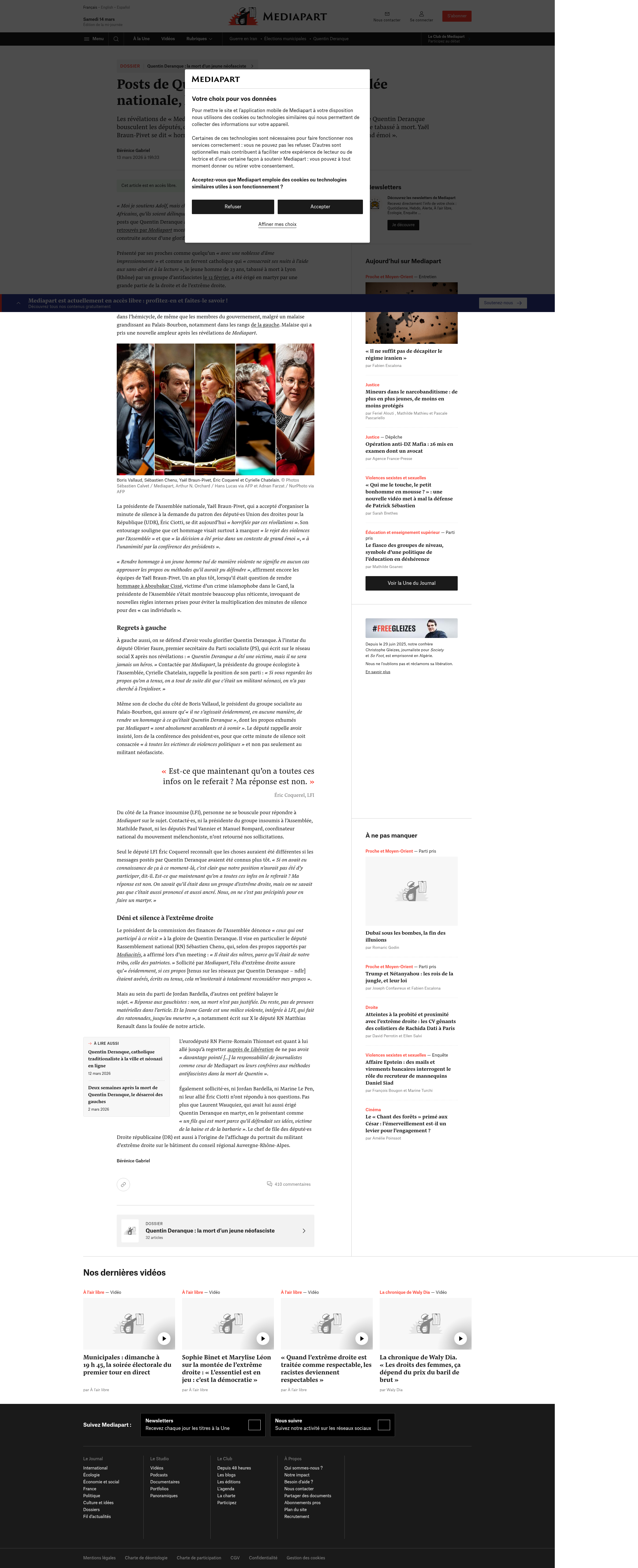 Posts de Quentin Deranque : à l’Assemblée nationale, le malaise granditLes révélations de « Mediapart » sur les nombreuses publications racistes et antisémites de Quentin Deranque bousculent les députés, qui avaient rendu hommage mi-février au militant d’extrême droite …PNGPDF