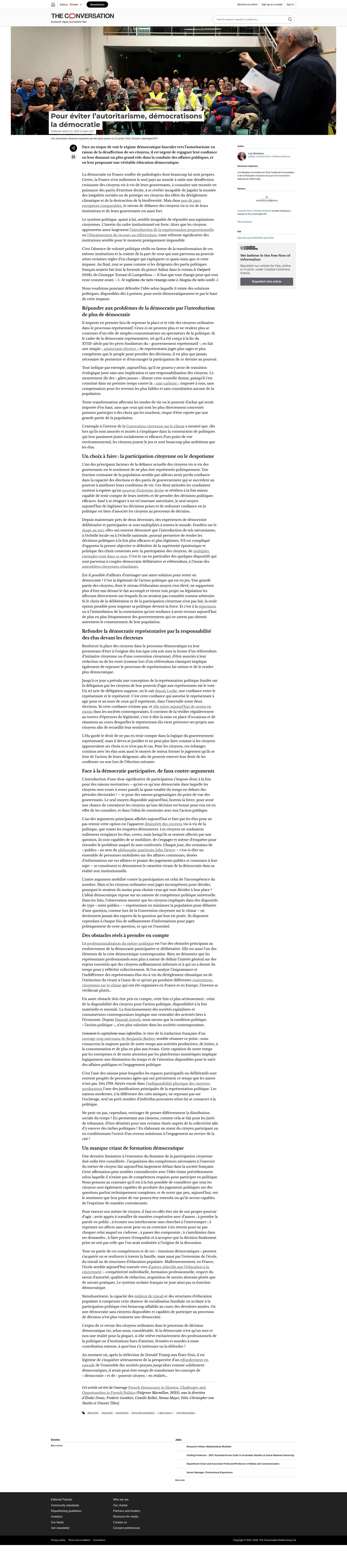 Pour éviter l’autoritarisme, démocratisons la démocratieLa démocratie en France traverse une crise. Il est urgent de regagner la confiance des citoyens en leur donnant un plus grand rôle dans les affaires publiques.PNGPDF