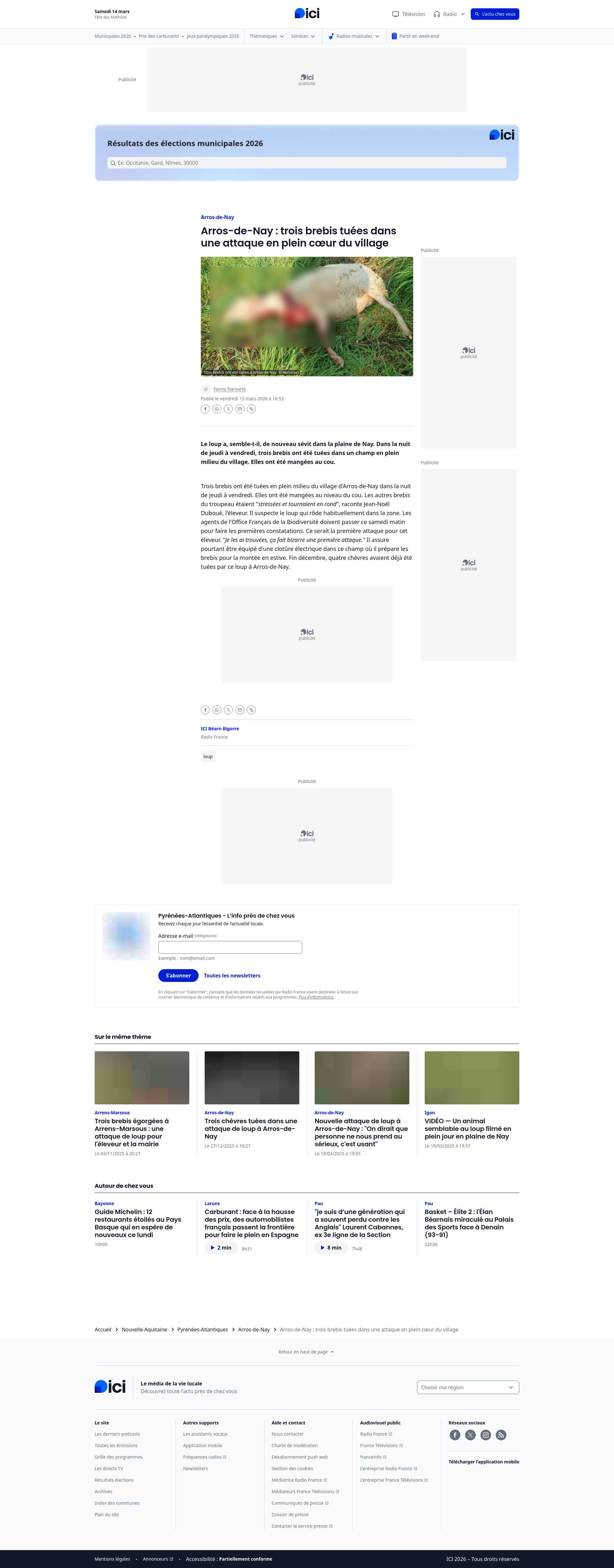 Arros-de-Nay : trois brebis tuées dans une attaque en plein cœur du village - ICILe loup a, semble-t-il, de nouveau sévit dans la plaine de Nay. Dans la nuit de jeudi à vendredi, trois brebis ont été tuées dans un champ en plein milieu du village. Elles ont été mangées au cou. PNGPDF