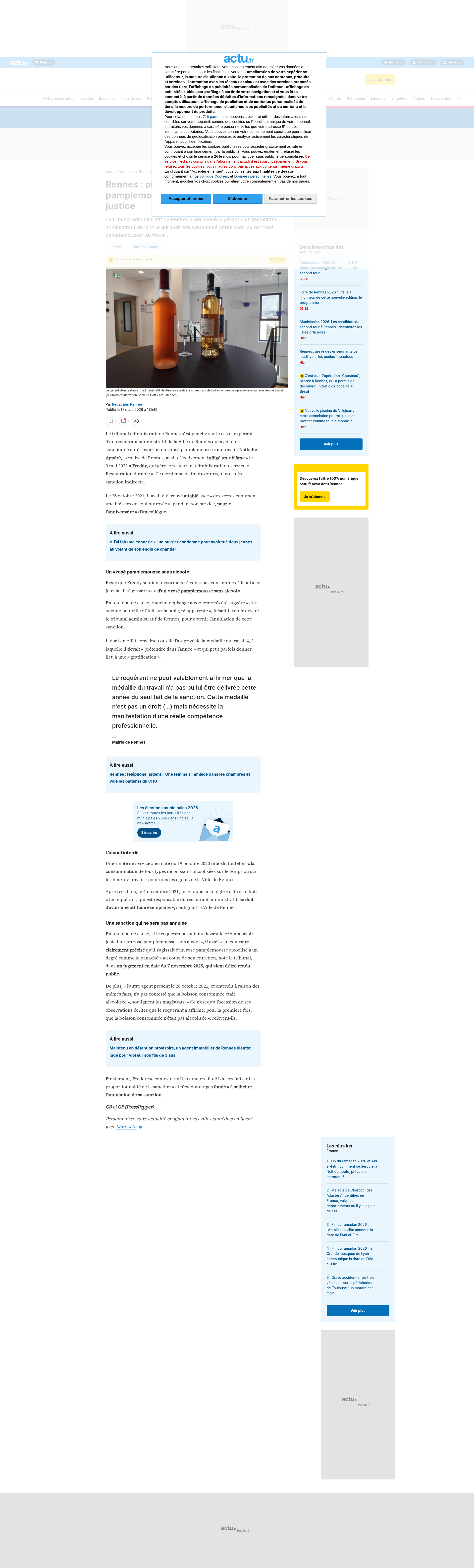 Rennes : privé de médaille pour un rosé-pamplemousse, il attaque la Ville en justiceLe tribunal administratif de Rennes a désavoué le gérant d'un restaurant administratif de la Ville qui avait été sanctionné après avoir bu du "rosé pamplemousse" au travail.PNGPDF