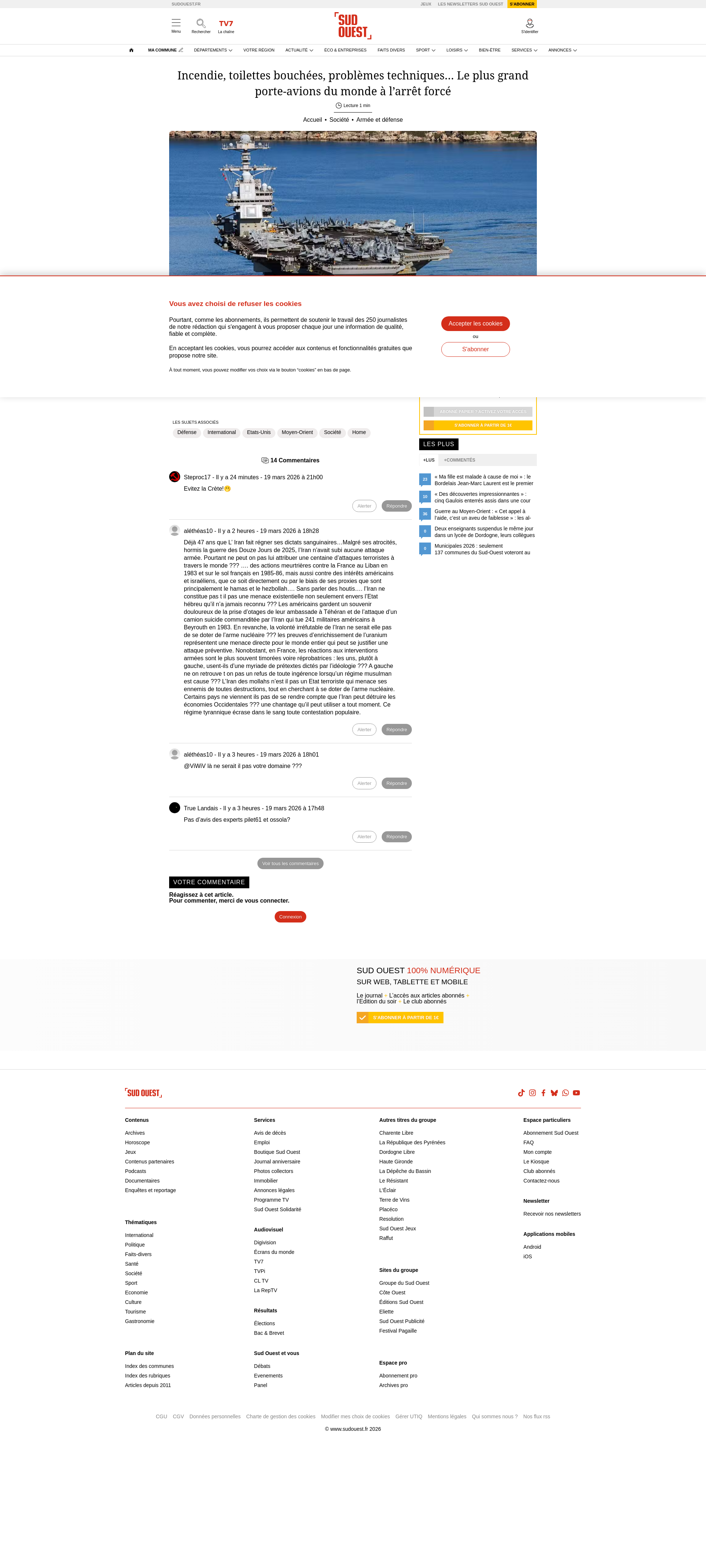 Incendie, toilettes bouchées, problèmes techniques… Le plus grand porte-avions du monde à l’arrêt forcéActuellement déployé au Moyen-Orient, l’USS Gerald R. Ford doit faire escale en Grèce après un incendie dans la buanderie et des problèmes chroniques de canalisations bouchées qui pèsent sur le quotidien de l’équipagePNGPDF