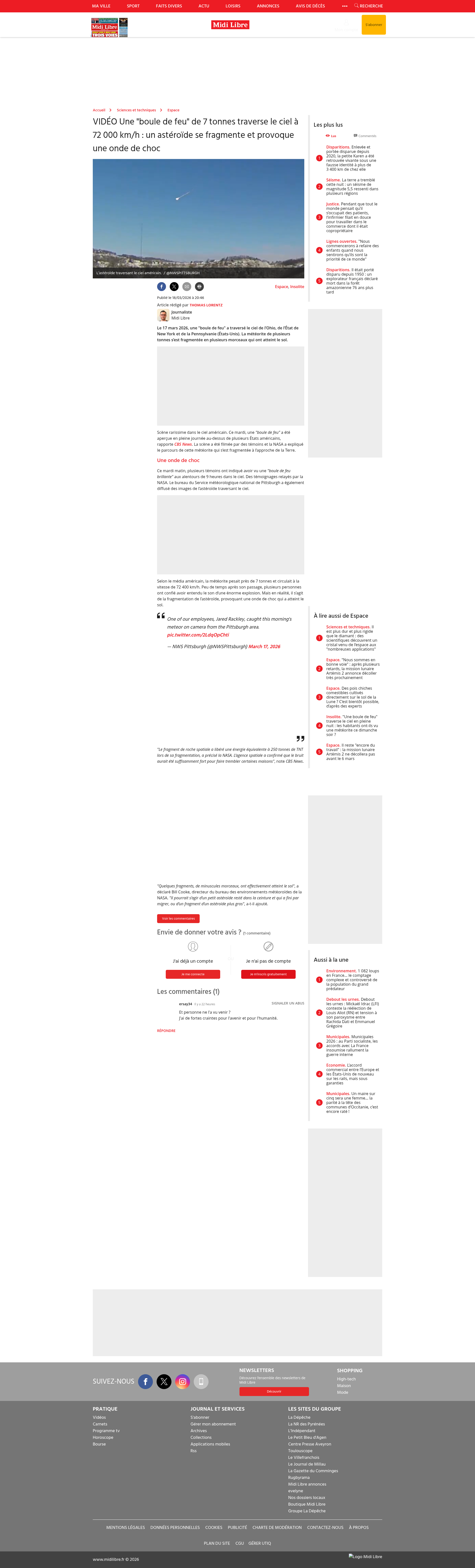 VIDÉO Une "boule de feu" de 7 tonnes traverse le ciel à 72 000 km/h : un astéroïde se fragmente et provoque une onde de chocLe 17 mars 2026, une "boule de feu" a traversé le ciel de l’Ohio, de l’État de New York et de la Pennsylvanie (États-Unis). La météorite de plusieurs tonnes s’est fragmentée en plusieurs morceaux qui ont atteint le sol.PNGPDF