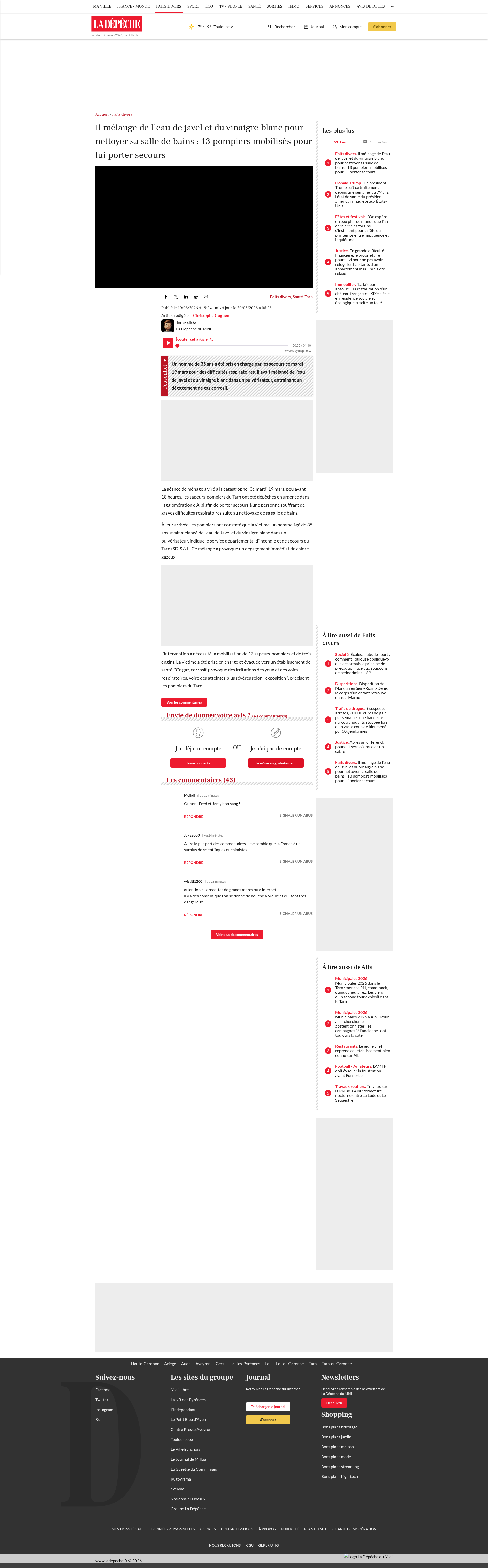 Il mélange de l’eau de javel et du vinaigre blanc pour nettoyer sa salle de bains : 13 pompiers mobilisés pour lui porter secoursUn homme de 35 ans a été pris en charge par les secours ce mardi 19 mars pour des difficultés respiratoires. Il avait mélangé de l’eau de javel et du vinaigre blanc dans un pulvérisateur, entraînant un dégagement de...PNGPDF