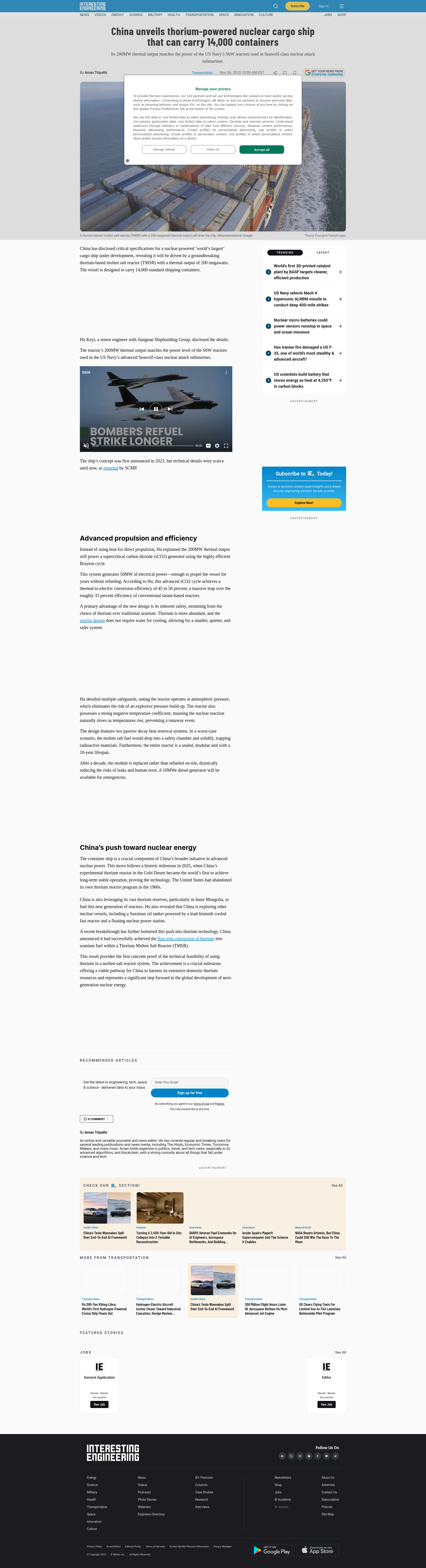 China unveils thorium-fueled nuclear ship to carry 14,000 containersChina reveals the specs for its 14,000-container nuclear cargo ship, powered by an ultra-efficient 200MW thorium molten salt reactor (TMSR).PNGPDF