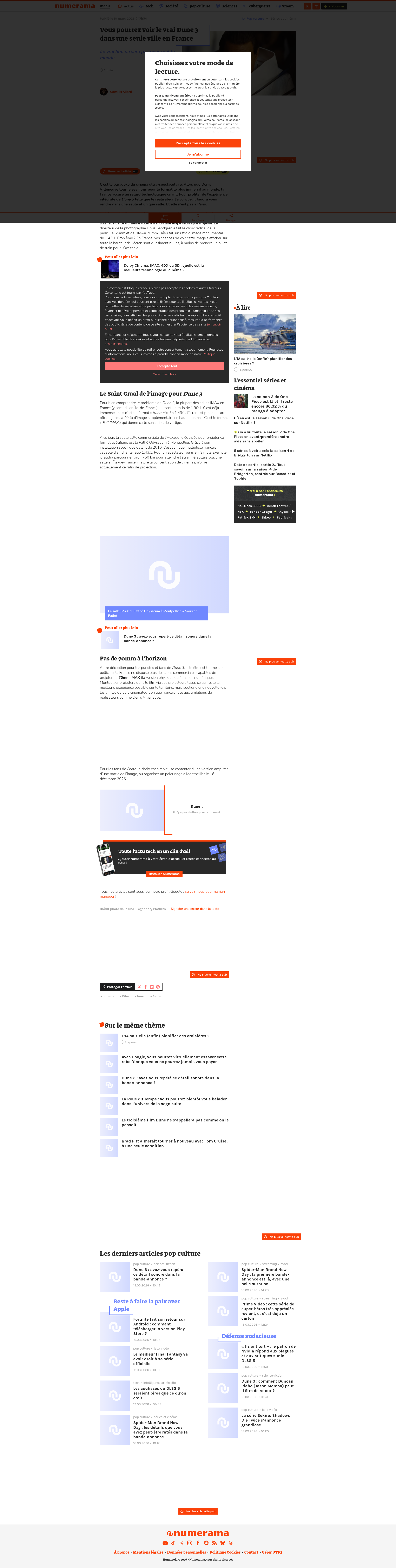 Pourquoi les Parisiens devront faire 750 km pour voir le vrai Dune 3C'est le paradoxe du cinéma ultra-spectaculaire. Alors que Denis Villeneuve tourne ses films pour le format le plus immersif au monde, la France accuse un retard technologique criant. Pour profiter de l'expérience intégrale de Dune 3 telle que le réalisateur l'a conçue, il faudra vous rendre dans une seule et uniquePNGPDF