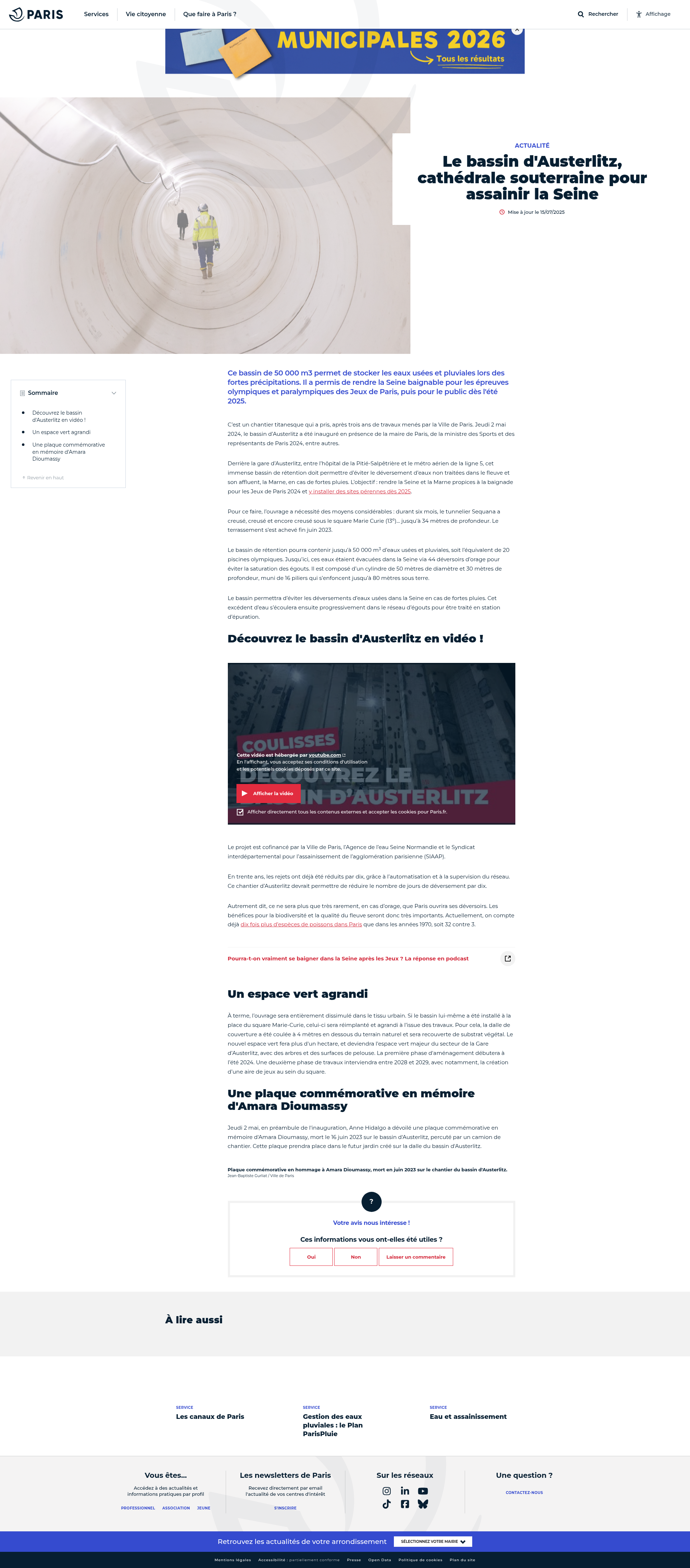 Le bassin d'Austerlitz, cathédrale souterraine pour assainir la SeineCe bassin de 50 000 m3 permet de stocker les eaux usées et pluviales lors des fortes précipitations. Il a permis de rendre la Seine baignable pour les épreuves olympiques et paralympiques des Jeux de Paris, puis pour le public dès l'été 2025.PNGPDF