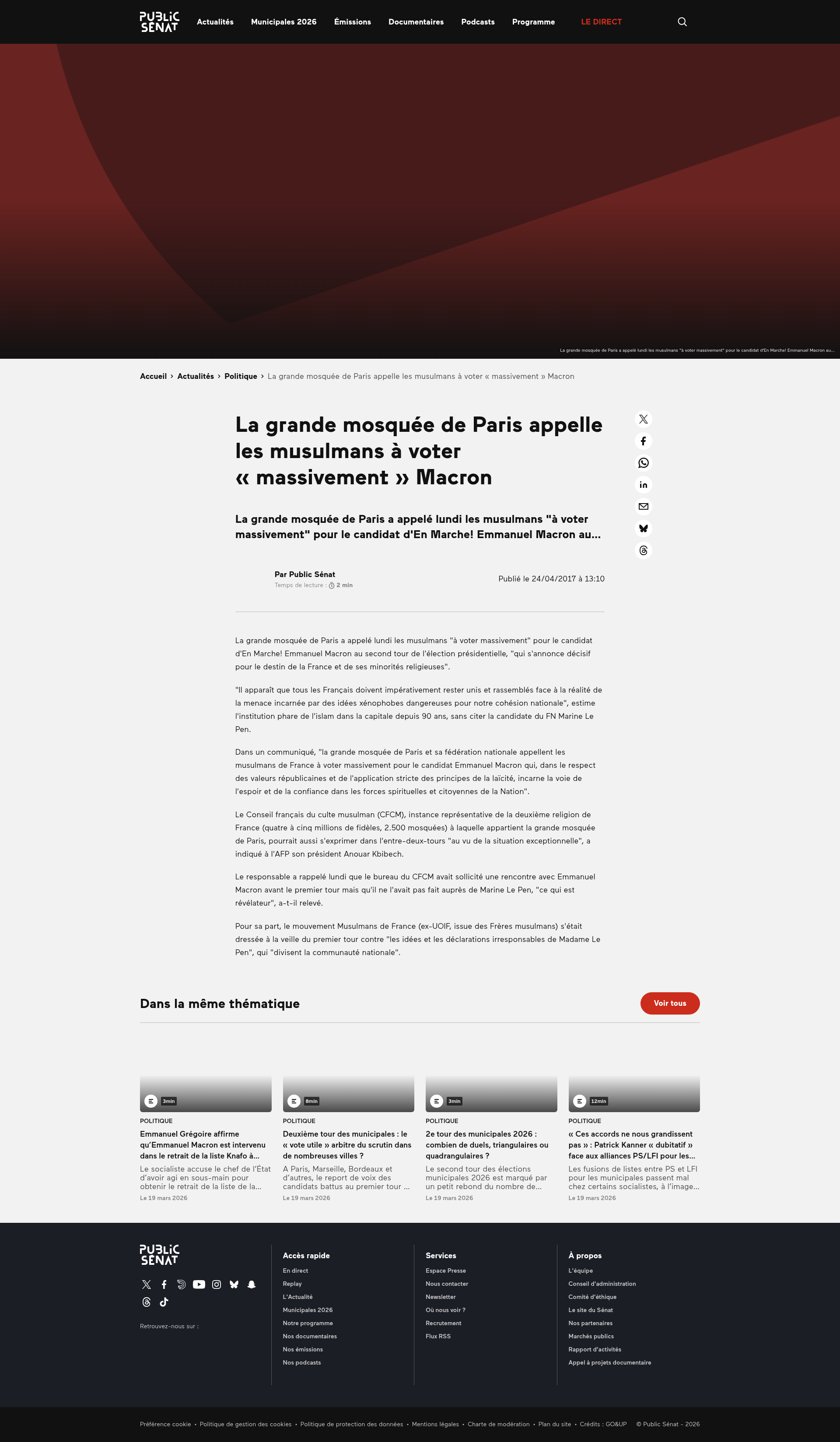 La grande mosquée de Paris appelle les musulmans à voter "massivement" MacronLa grande mosquée de Paris a appelé lundi les musulmans "à voter massivement" pour le candidat d'En Marche! Emmanuel Macron au...PNGPDF
