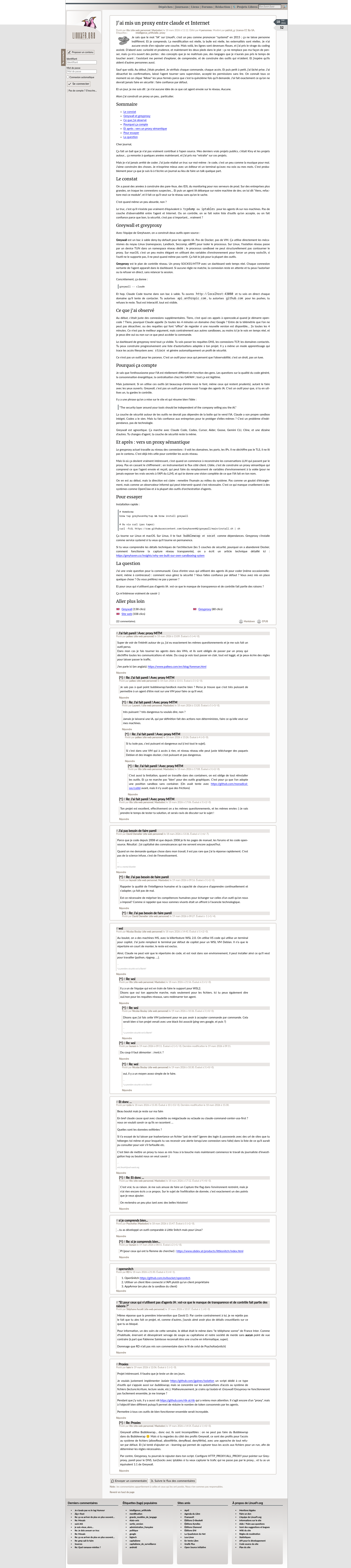 J'ai mis un proxy entre claude et Internet - LinuxFr.orgL’actualité du logiciel libre et des sujets voisins (DIY, Open Hardware, Open Data, les Communs, etc.), sur un site francophone contributif géré par une équipe bénévole par et pour des libristes enthousiastesPNGPDF