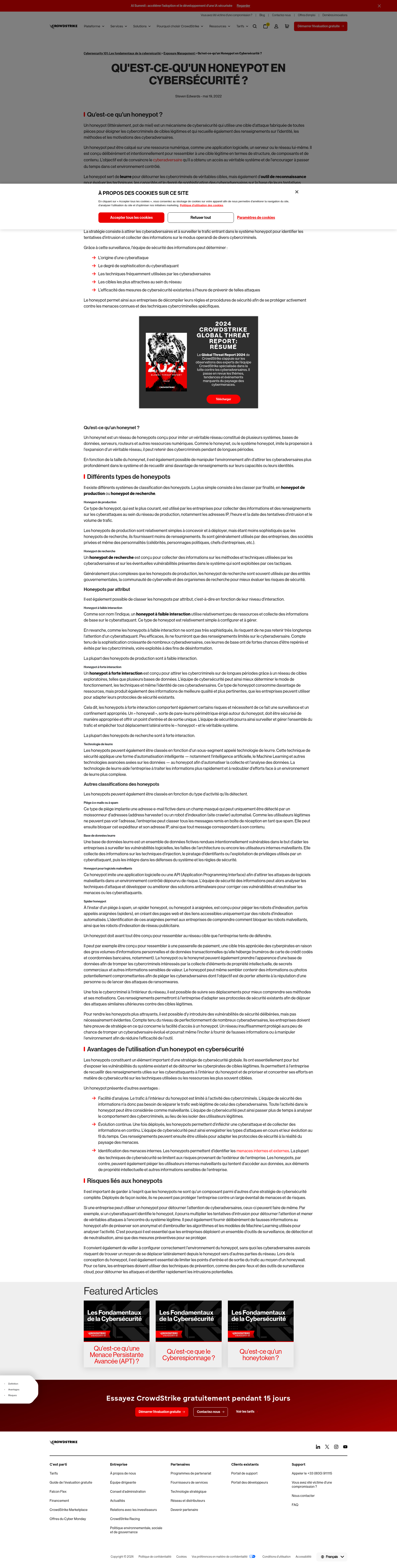 Qu'est-ce-qu'un Honeypot? | CrowdStrikeUn honeypot est un mécanisme de cybersécurité qui utilise une cible d'attaque fabriquée de toutes pièces pour éloigner les cybercriminels de cibles légitimes et qui recueille également des renseignements sur l'identité, les méthodes et les motivations des cyberadversaires.PNGPDF