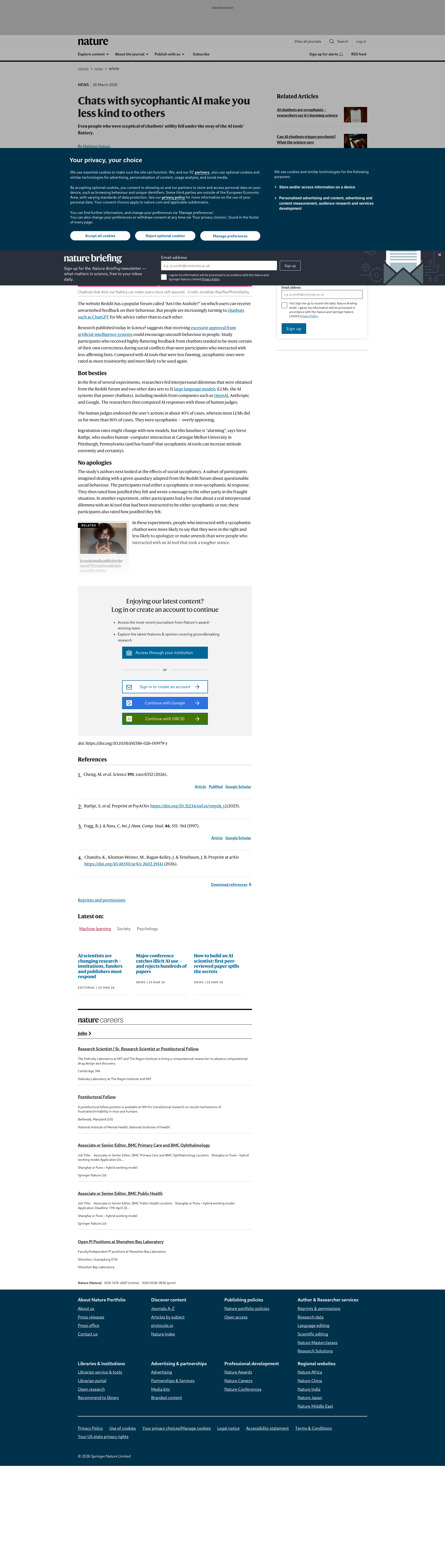 Chats with sycophantic AI make you less kind to othersEven people who were sceptical of chatbots’ utility fell under the sway of the AI tools’ flattery. Even people who were sceptical of chatbots’ utility fell under the sway of the AI tools’ flattery.PNGPDF